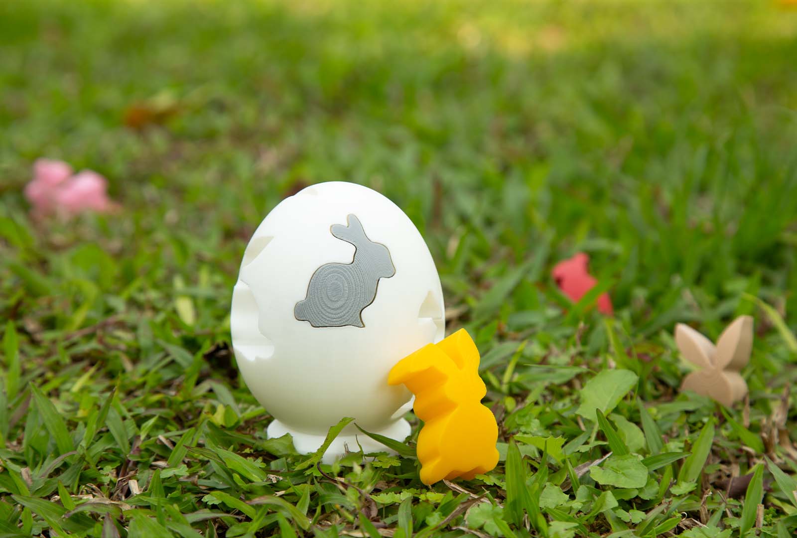 Add an extra challenge to your egg hunt with 3D printed egg puzzles! This clever design features a hollow egg with rabbit silhouettes carved into the shell, paired with corresponding colorful bunny pieces that fit perfectly into each opening.