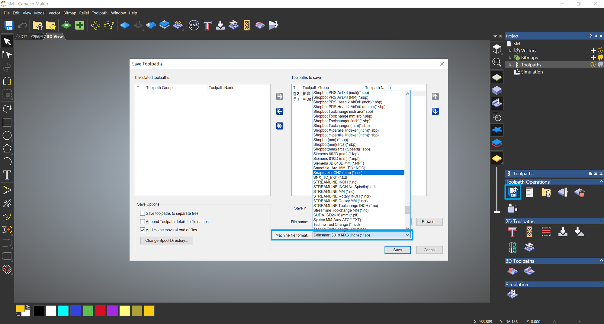 to save your toolpath. In the pop-up window, select the post processing method that has been imported in the drop-down list of Machine file format, and click Save to export the G-code. Now, we can send the G-code to the CNC machine for carving and simply wait for the finished product.