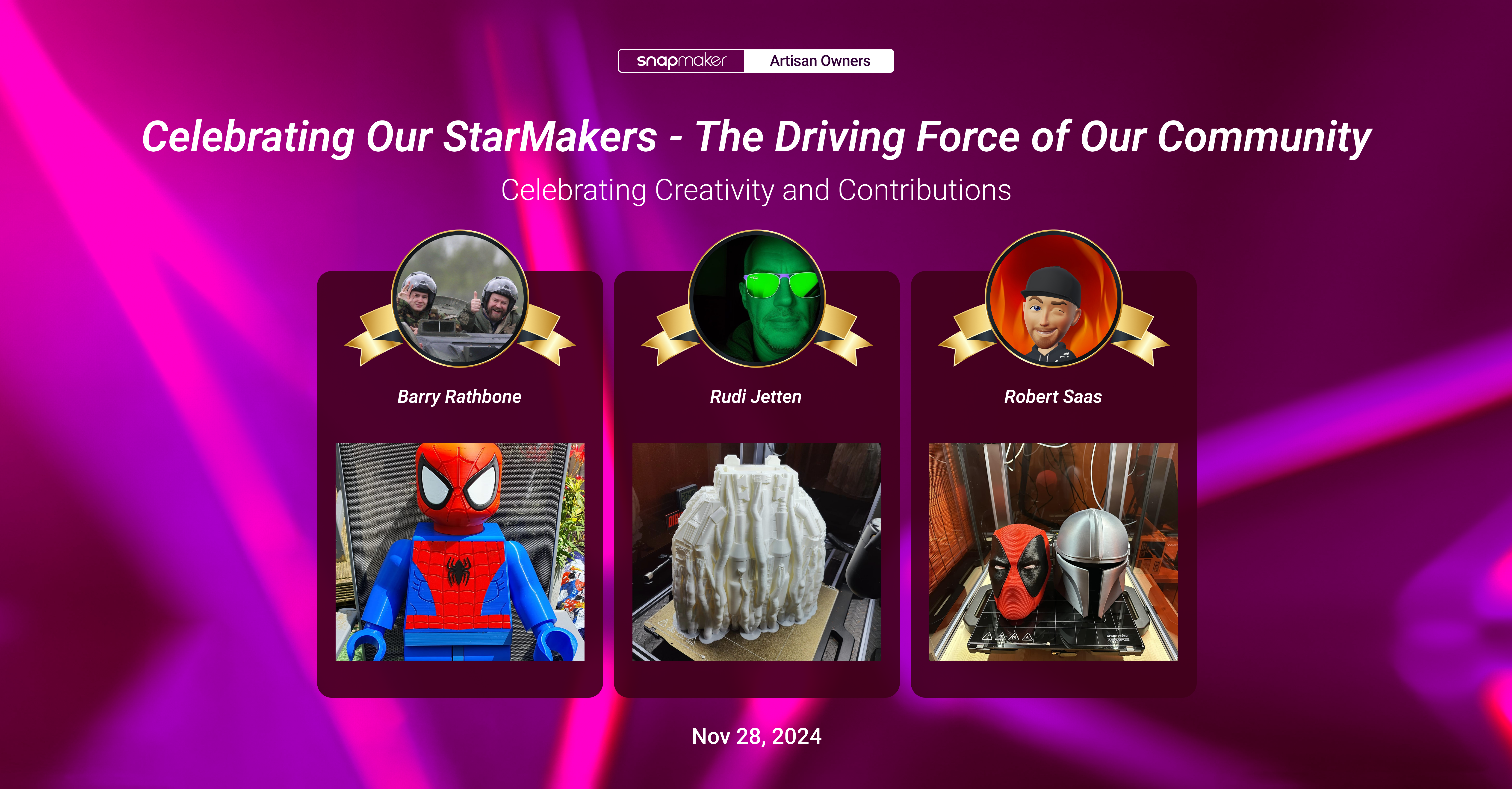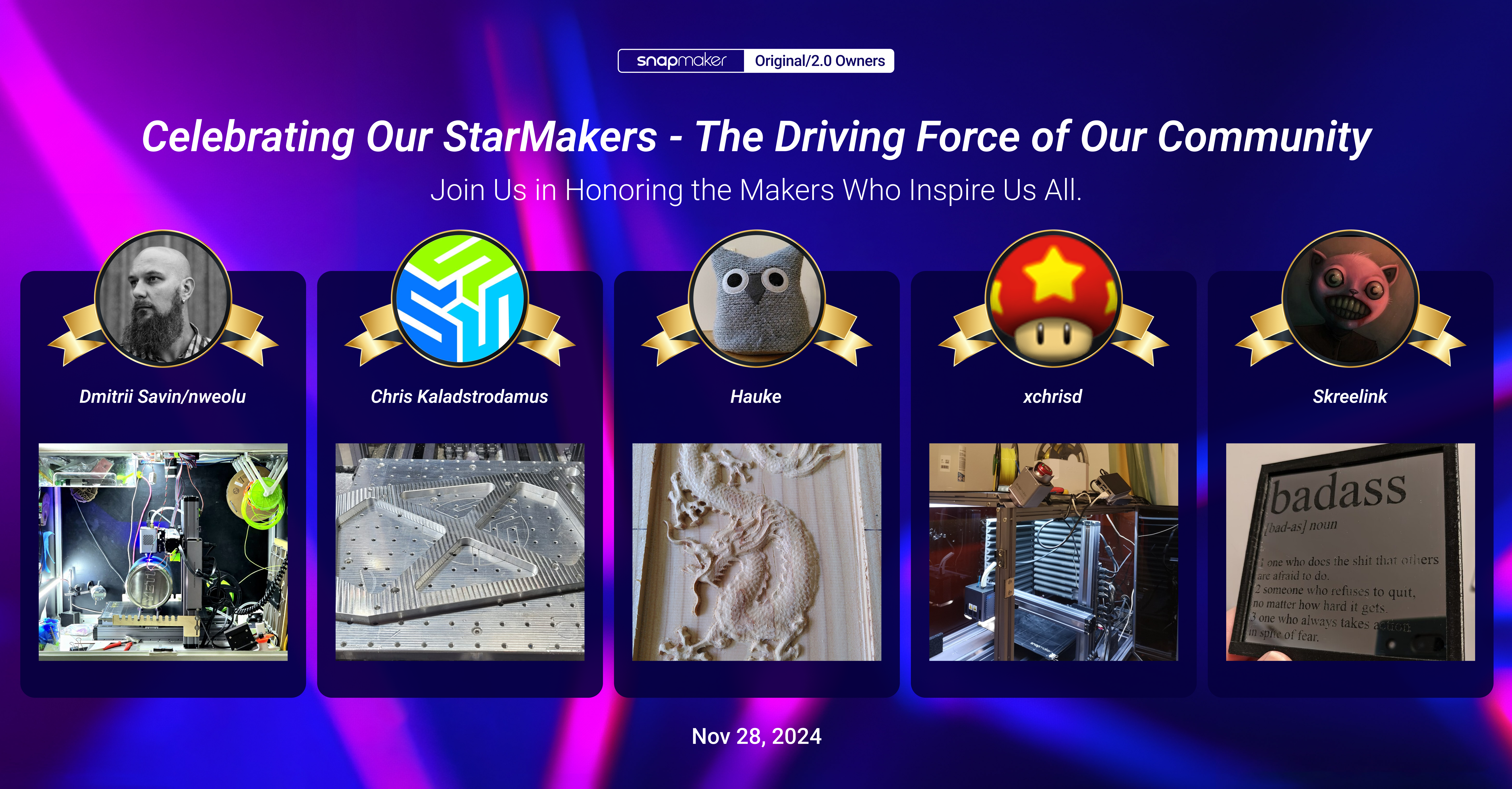 Hello Snapmaker Community, As we come together to celebrate Thanksgiving 2024, it’s the perfect moment to show our heartfelt appreciation for those who have gone above and beyond in contributing to our community – our StarMakers!