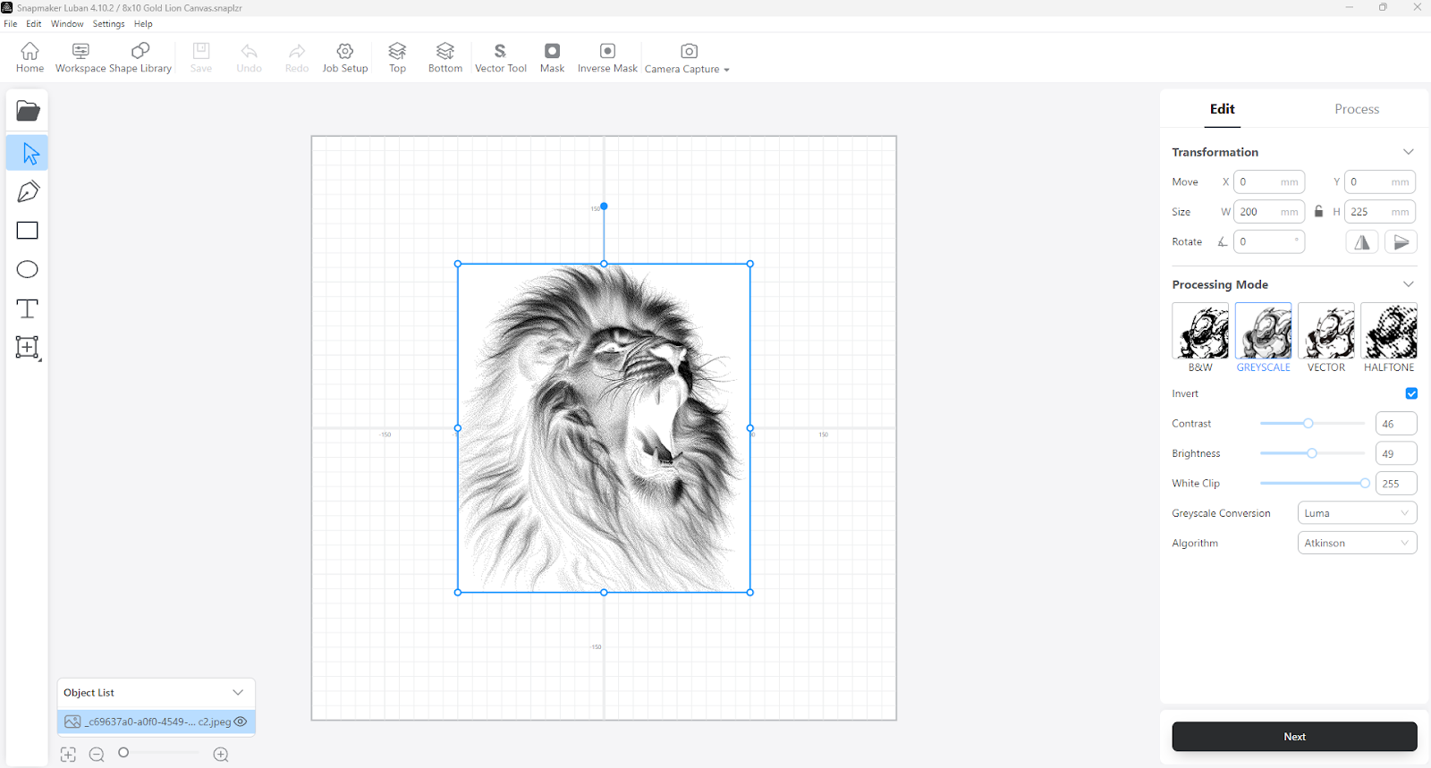 In your laser software, import the image you intend to use. After the image is imported and displayed on your screen, you may need to adjust the image settings. Adjust the settings such as the X and Y position to get the image centered. Adjust the size of your image to match that of your canvas selection. In the Processing Mode image settings, Grayscale and Black and White work best. If you have painted the final layer of your canvas a dark color such as black, invert the image. You can further adjust the contrast, brightness, white clip, and grayscale conversion algorithm. For your first few attempts, you should stick with the default settings, as they will give you optimal results.