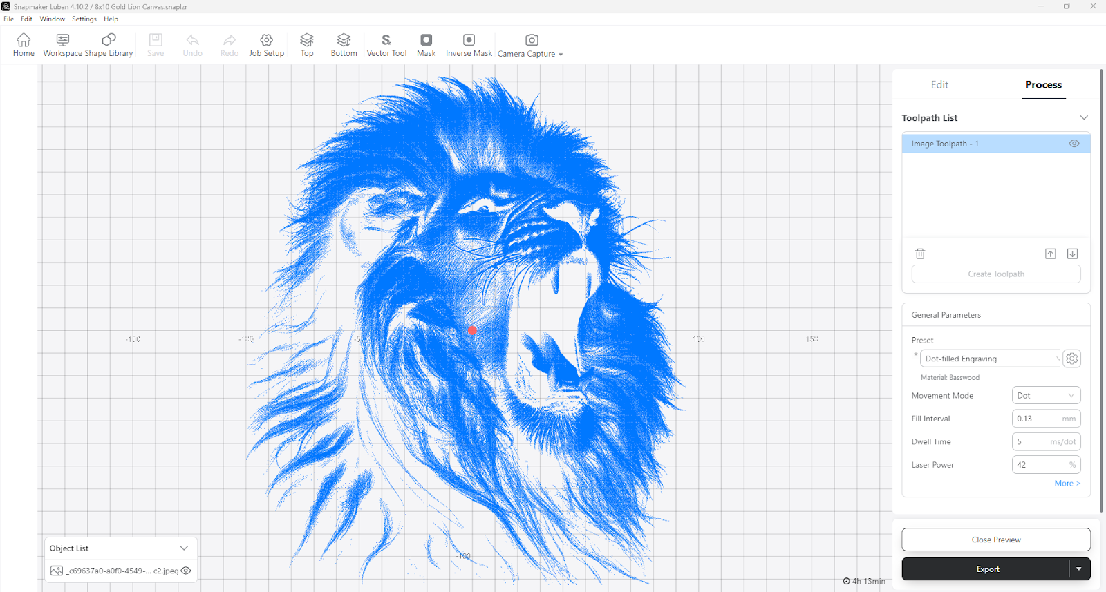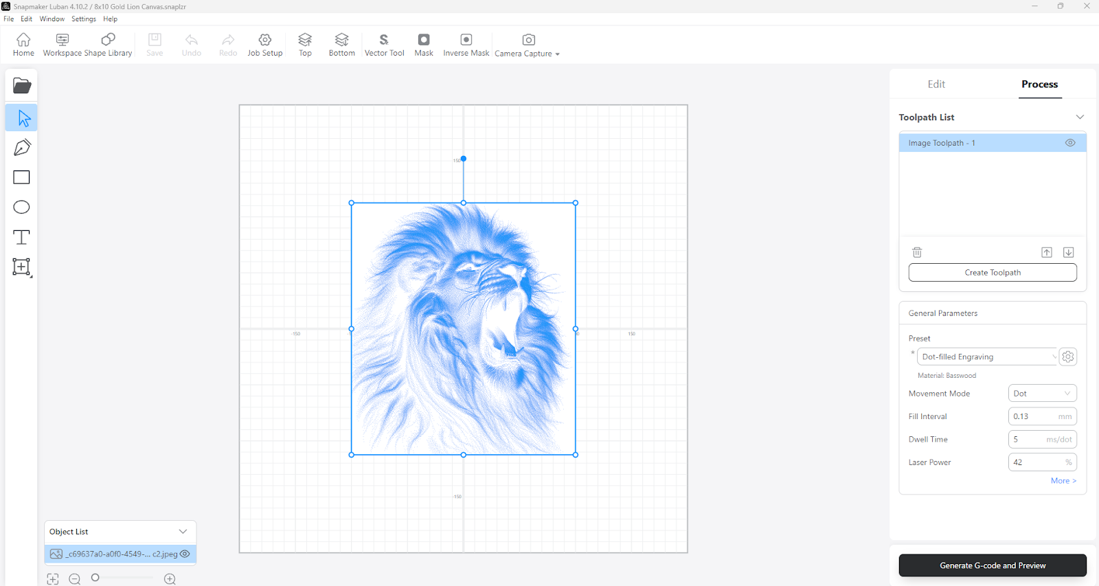 You can now select Generate G-code and see your final image to be engraved, and the estimated time for the project. This is your last opportunity to fine-tune your settings. If you are satisfied with how everything looks, you can now export the project to the flash drive.