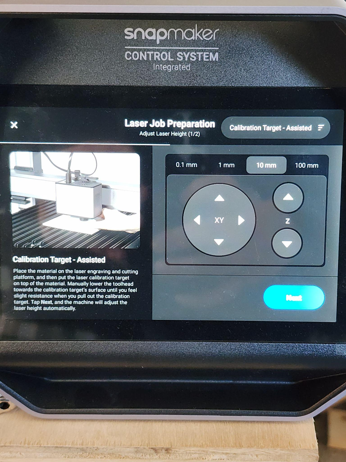 Now you can align your laser module, using the touchscreen, with the canvas, according to your image origin position, and adjust the position of the laser using the calibration target for the laser, to be at the proper height above the canvas.