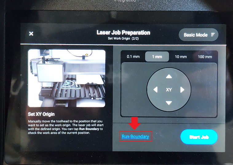 Next, you can run your laser boundary, to further check if the work origin is proper. Make adjustments as needed. Once you are satisfied with the placement, you can start the laser engraving process.