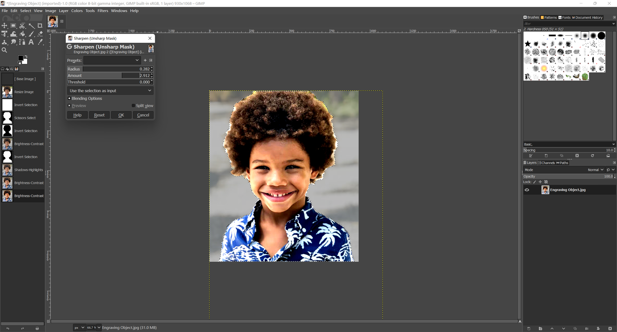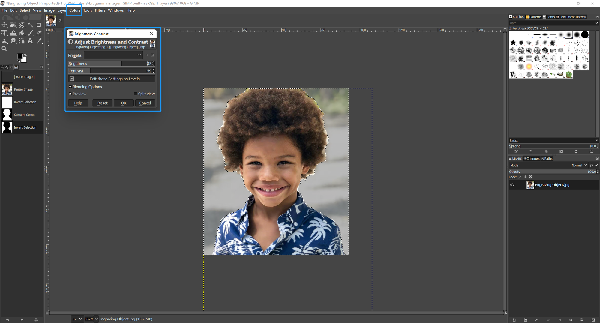 The purpose we edit the picture is to emphasize the subject and sharpen the edges, producing a clear and distinctive engraving result. It does not require a lot of complex photo editing skills to achieve the effects we want. The operations we need to perform on the picture mainly include cropping, adjusting contrast and brightness, sharpening. You can use any photo editing program that includes these basic functions. Here we use the free open-source raster graphics editor, GNU Image Manipulation Program (GIMP) for demonstration. Now, let’s open the picture in the editor and get started!