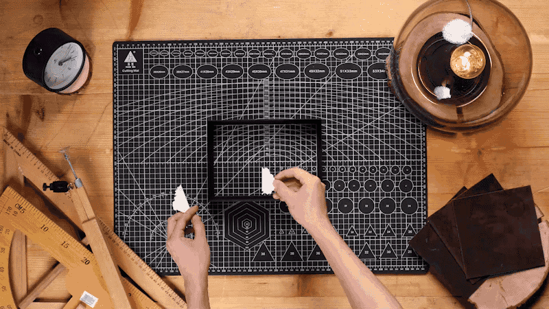 Lay the outer frame flat, with its back facing upwards. Put the paper silhouettes in between each interlayer frame in the order of your designing, and press it down to make sure all the pieces are securely seated.