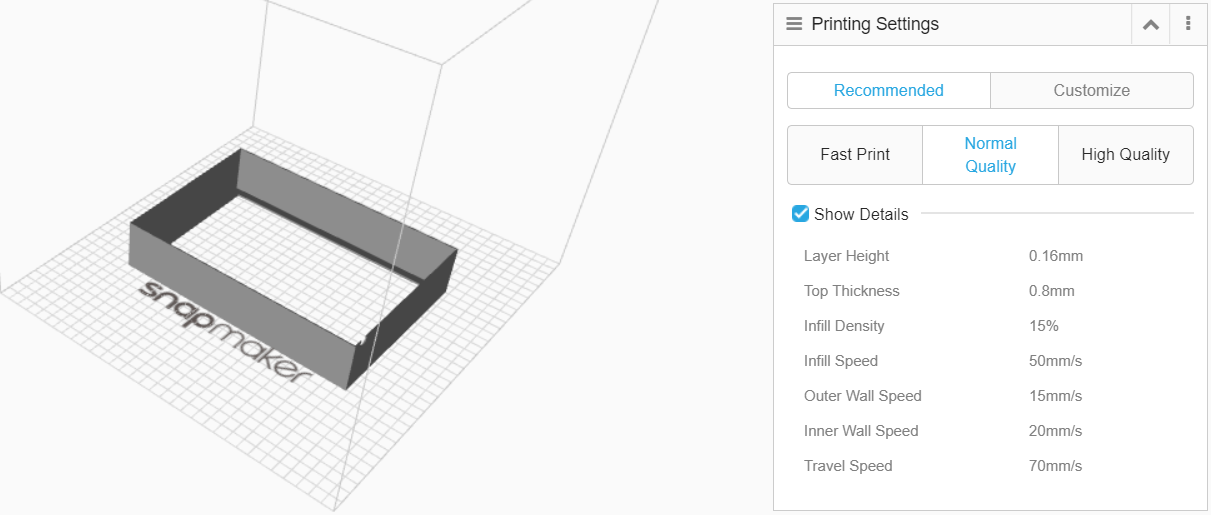 The other parts of the lamp, including outer frame, interlayer frames and back panel can be 3D printed. Download the STL files here, (www.thingiverse.com/thing:4562693) import them into Snapmaker Luban, and adjust the direction of the model to lay it down on the platform. For the parameter setting, let's just select the Normal mode: