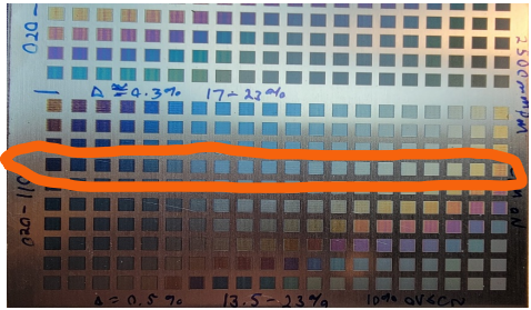 One subset of “images on steel” that I haven’t yet discussed takes advantage of one of the ways Lightburn can deal with images. When you import an image into Lightburn, it immediately converts the image into black and white (or “greyscale” to be more accurate). There are multiple techniques/algorithms that can be used to convert an image into greyscale, including dithering, as we’ve discussed previously. However, it is possible to choose none-of-the-above as a conversion method and to leave the image as a purely greyscale one, with the pixel “magnitude” at each point corresponding to how bright that particular pixel is. Pure black has a magnitude of “0” and pure white has a magnitude of “100”. In Lightburn’s case, this range of magnitudes can be set to any laser power range that you want, such that the “100” magnitude is set by the Minimum % power setting, and the “0” magnitude is set by the Maximum % power setting. This is inverted from what you might expect, because Lightburn assumes you will be using this process to burn images into wood, and the darkest parts of the image (“0” magnitude) will thus need the highest amount of laser power, and the lightest parts will need close to zero laser power. If you have already gone through the process of setting up material test arrays, you should be able to see that certain power ranges pretty well cover a range of colors from very dark to very light. In the image below, I show a particular power range that spans very dark blue to almost white. If you use that power range as your minimum and maximum power settings in the Lightburn cut editor window, you can produce an image on the steel.
