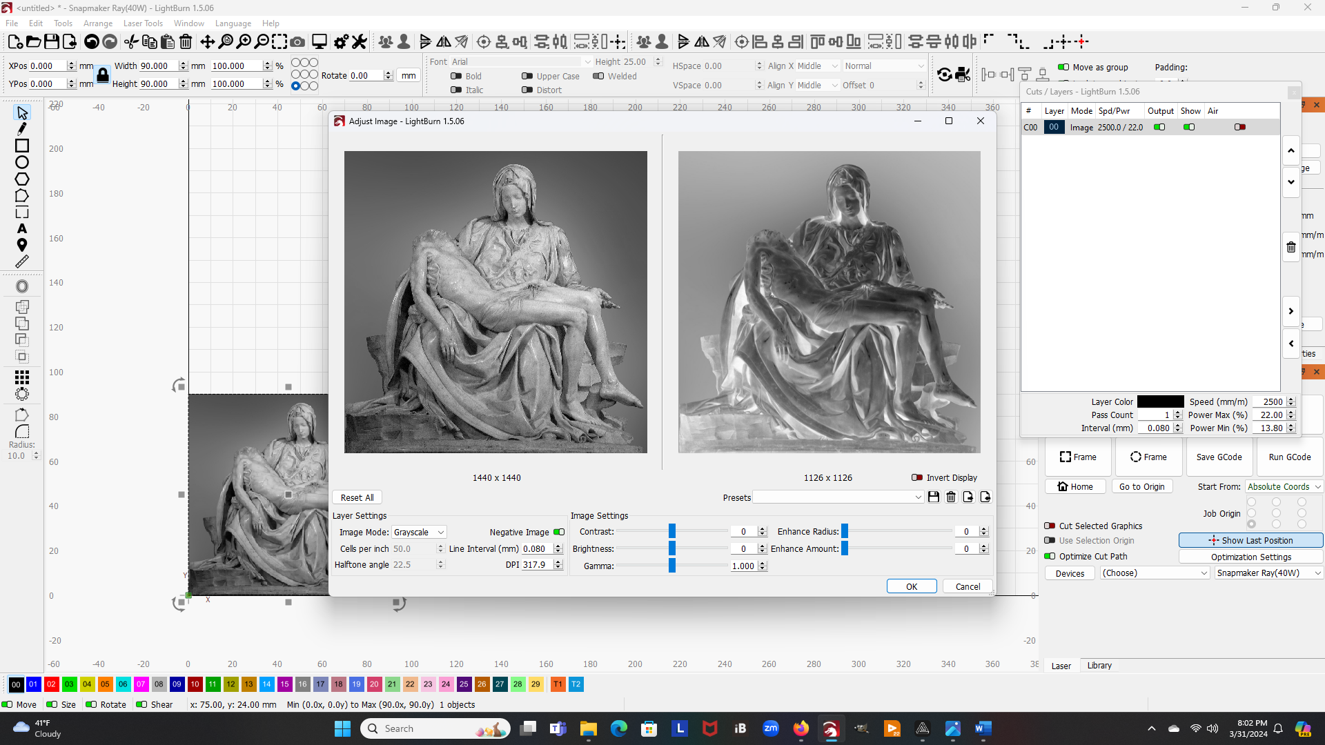 As with the other image “painting” method, now you can import the G-code file into the Luban workspace, align your laser, and generate your image. Below I show a couple of image created using this process. The image on the right used a reduced brightness to give a better dynamic range in the image.