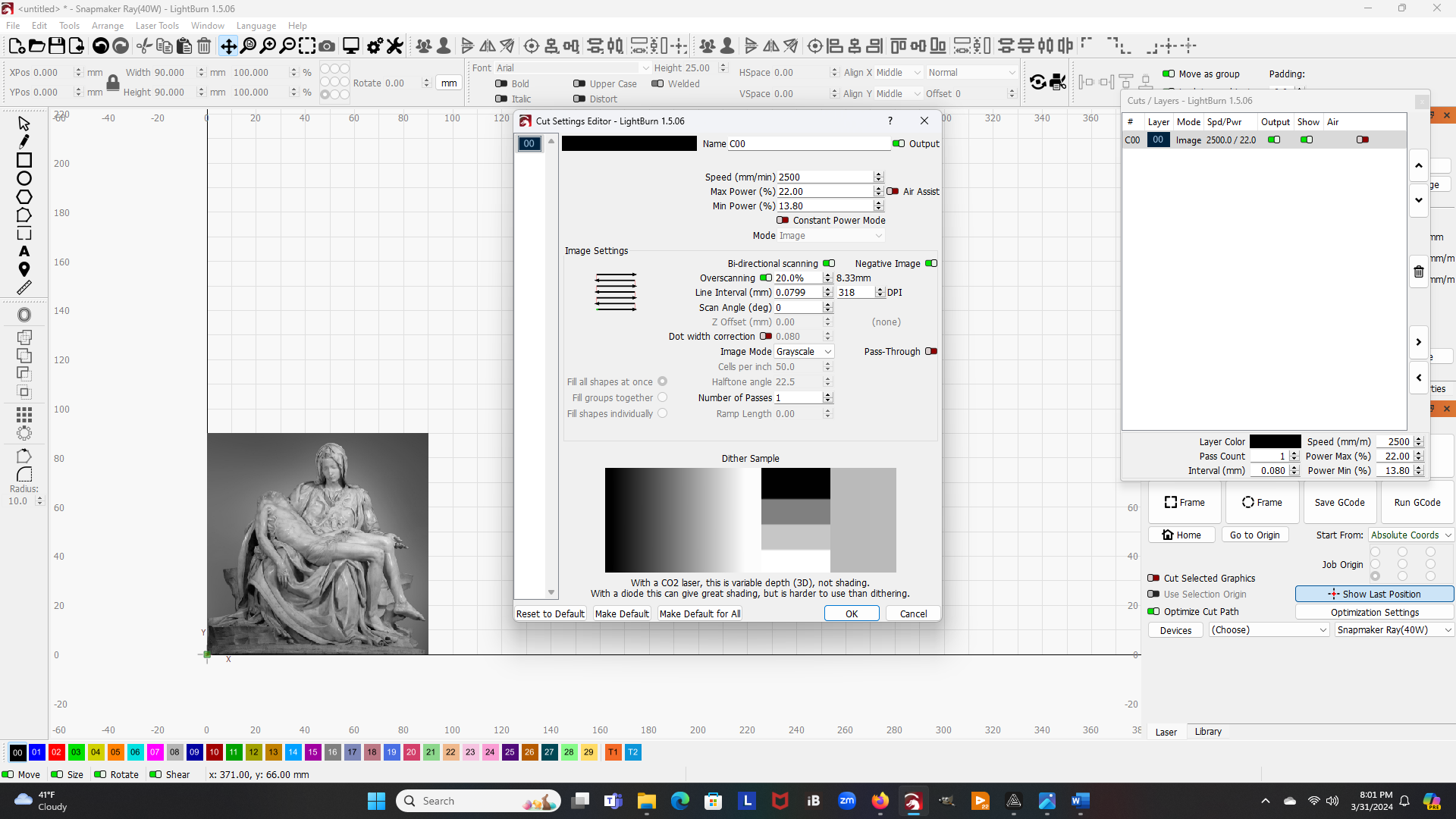 Using the Cut Settings Editor window, you now will fill out the laser speed, max and min power settings, overscanning range, line spacing, and Image Mode (Greyscale), as shown below. Once you have these values set, use the Save GCode button to create your G-code file.
