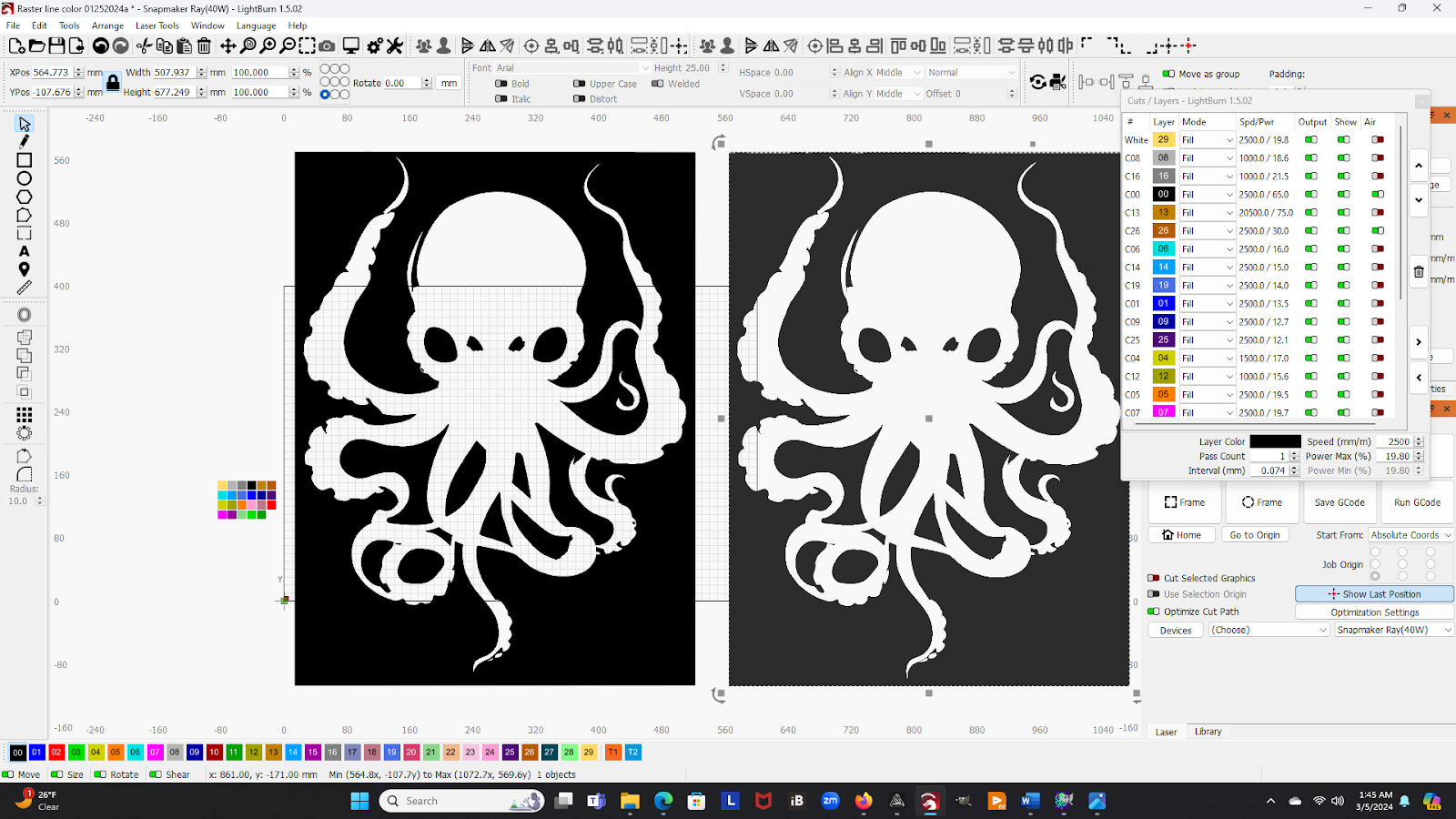 I will note here that in my attempts to set up LightBurn to work with my Snapmaker, I have somehow ended up with an X offset in the Luban G-code image of 21 mm (negative), which you can see in the above picture. However, the origin of the image generated by the diode laser still uses the red laser crosshair point as its effective origin. So I just ignore the offset in the image on the screen.