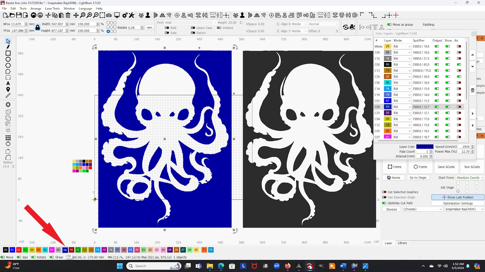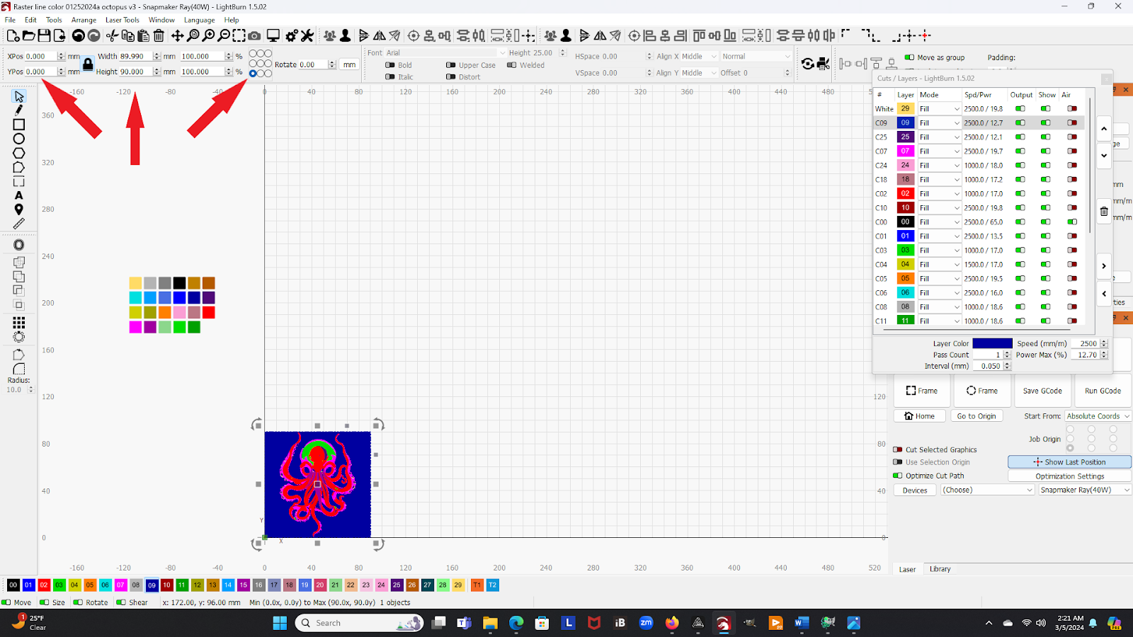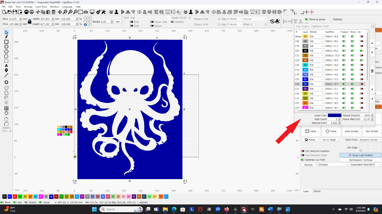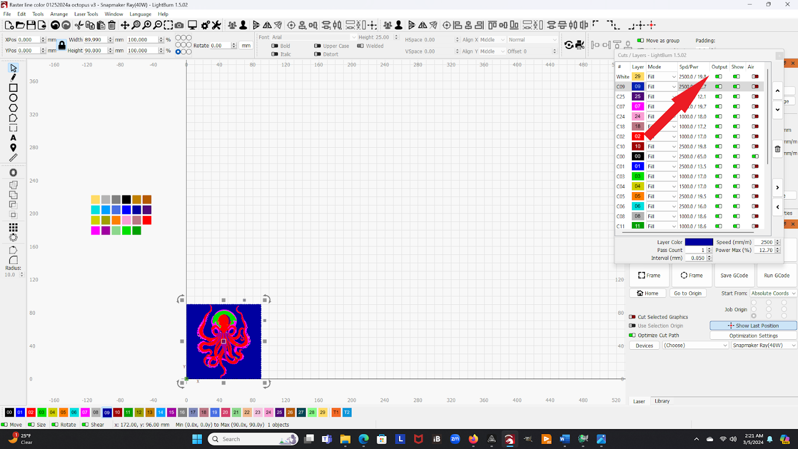 If you find that the laser time is longer than you wish to babysit the Ray, you can “turn off” layers by switching the Output to OFF in the Cuts / Layers window (see arrow). You can choose to laser anything from a single layer to all the color layers, depending on how much time it will take vs how much time you want to spend babysitting the laser.