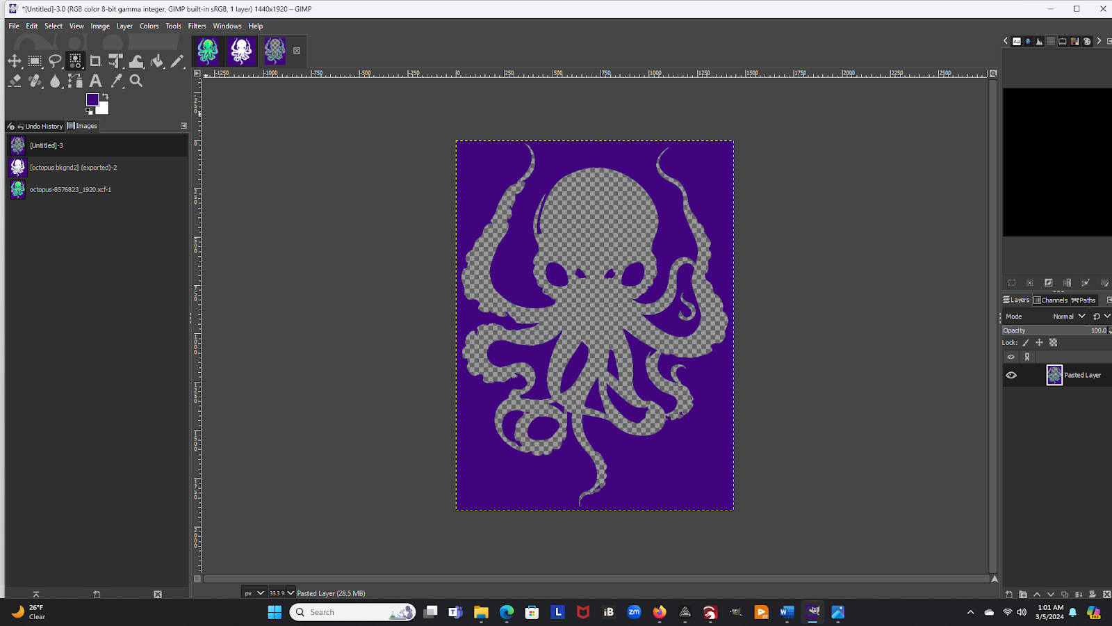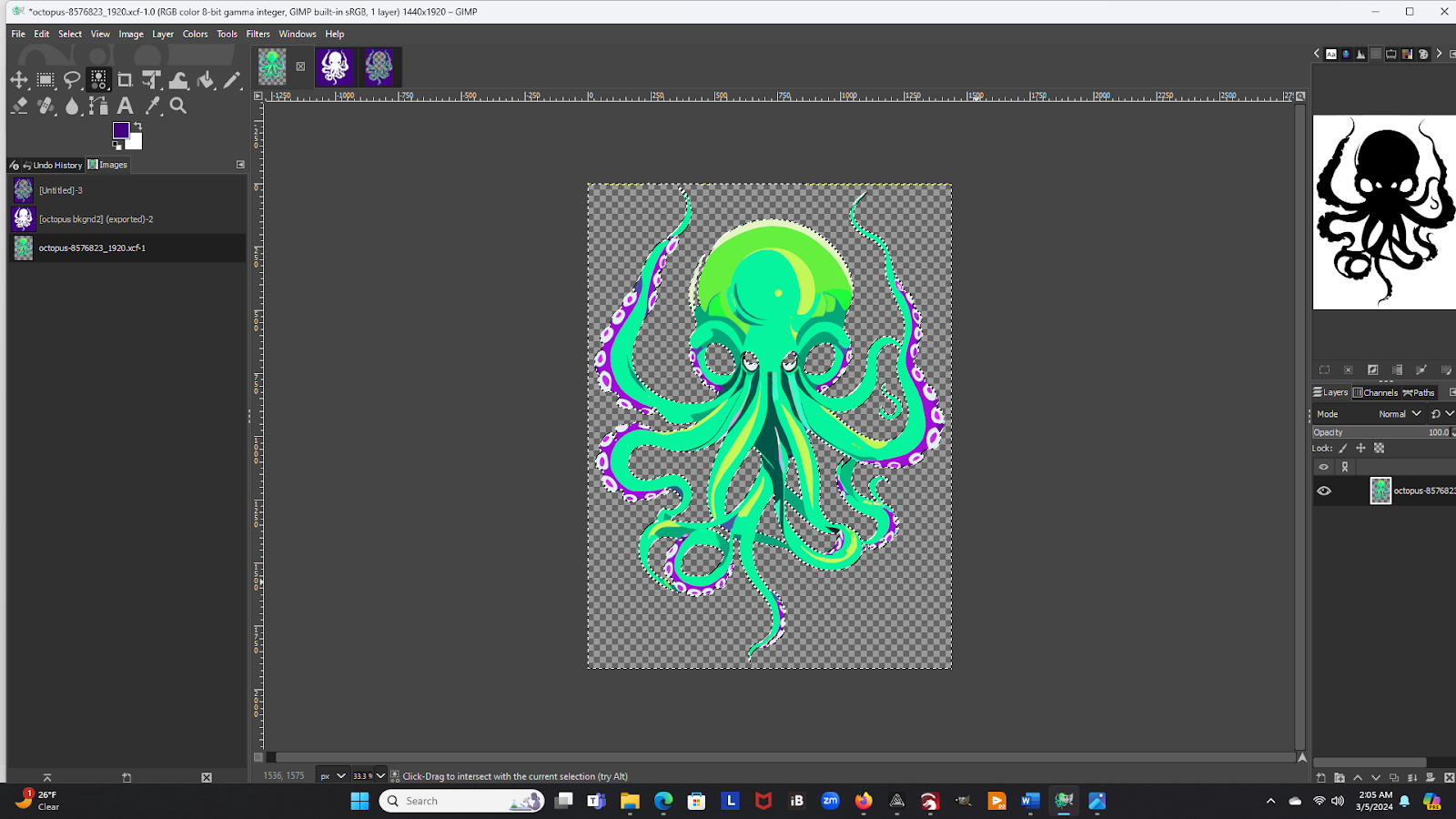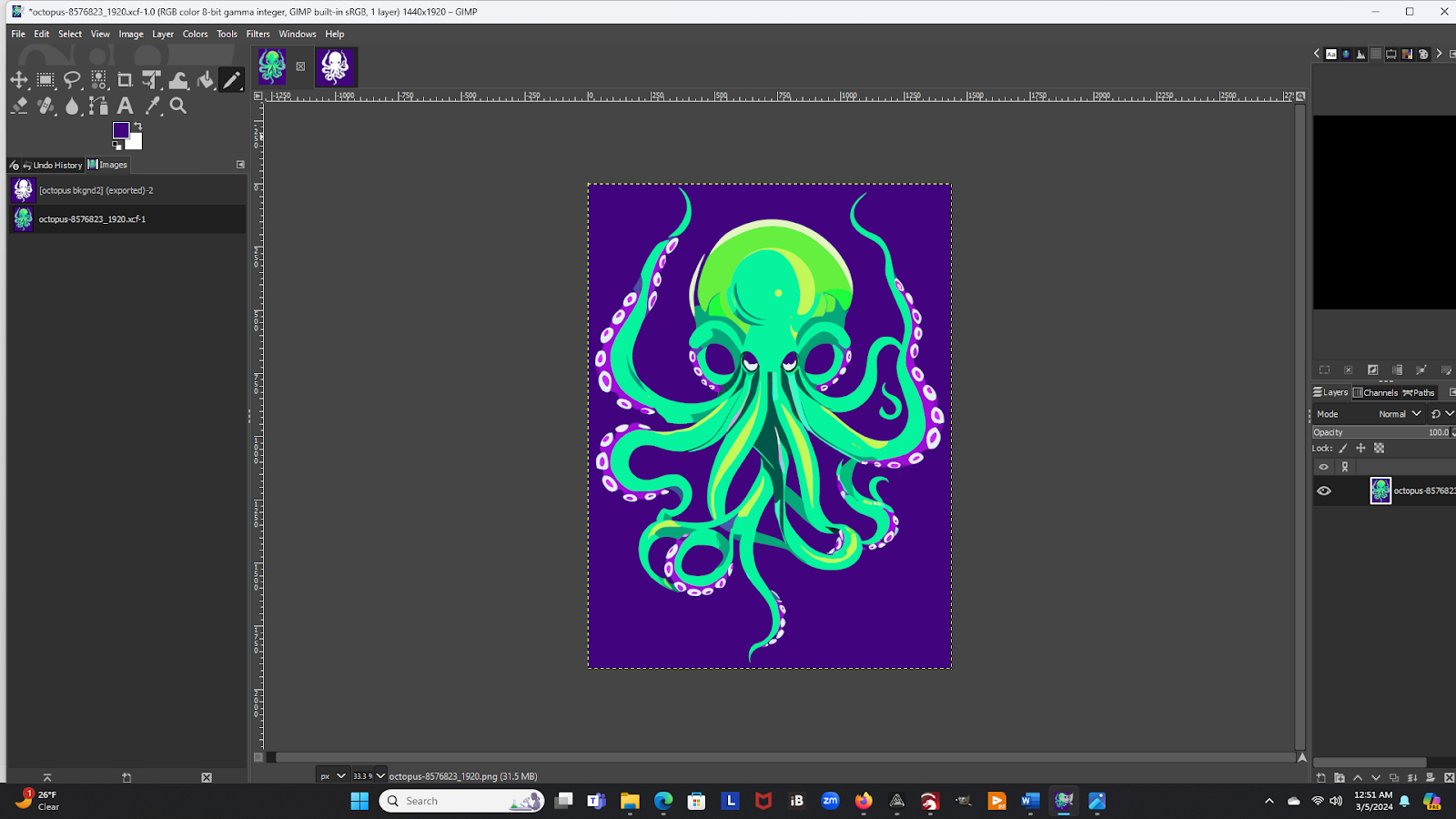 The next step in our process is to start breaking your picture down into its individual color components. There are many different image processing programs that could do many of the rest of these steps, but I chose GIMP for the simple reason is that it is free to use, and quite powerful. Using our Octopus as an example, this is what my screen looks like after I’ve opened the file in GIMP.