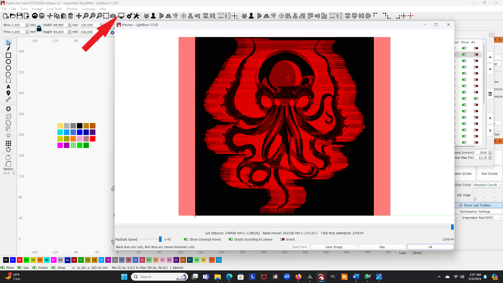 By clicking on the Preview icon at the top of the LightBurn window (see arrow below) you can get a good estimate of how long the laser time is predicted to be once you press the START button on your Ray. I have found LightBurn’s estimates to be quite accurate if you have followed the instructions for setting up LightBurn to work with the Ray.