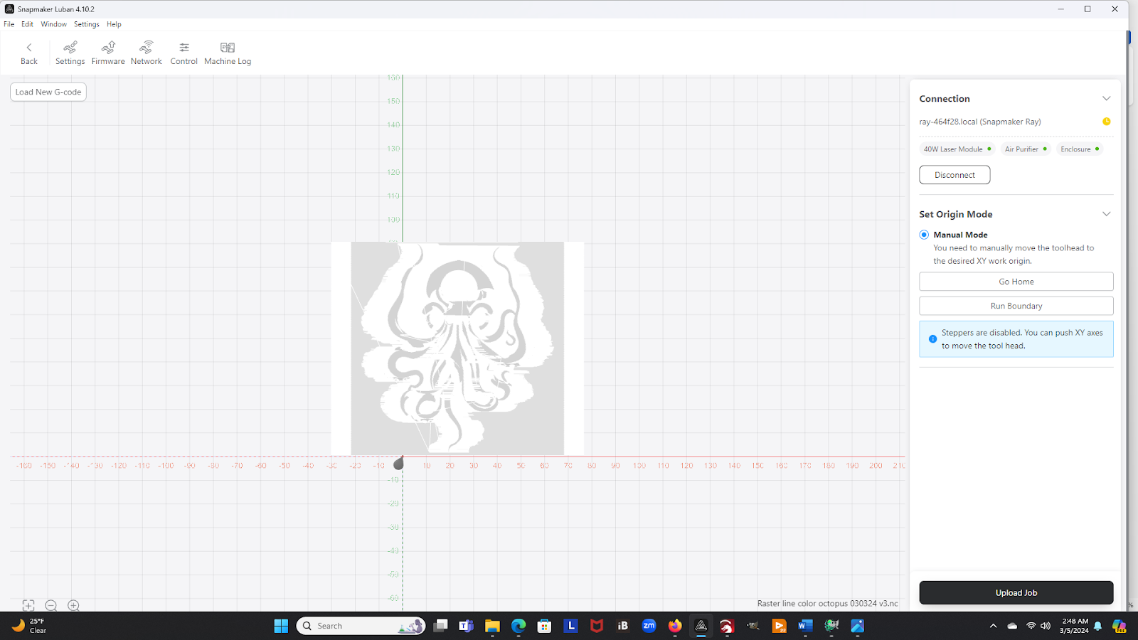 Once you have saved the G-code to your computer, you can start Luban and load the G-code into the Workspace window.