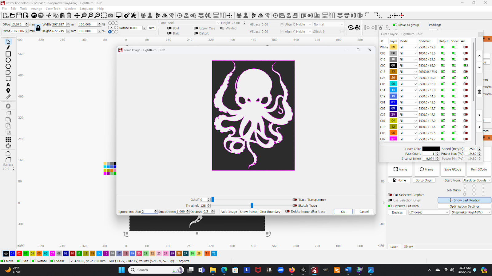 You can see my color test array on the left (outside the work area), a big copy of the background color image file in black and white in the middle of the screen, and my laser parameters Cuts / Layers window on the right side. Select the image with your cursor (you may need to click the Arrow icon on the left side of the screen).