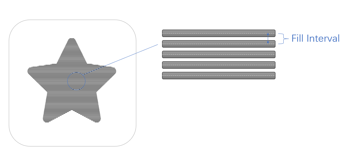 In the Line-filled Engraving mode, the Fill Interval defines the distance between the lines comprising the engraved pattern. If the Fill Interval is too large, the engraved pattern will be light-colored or even discontinuous; if too small, the lines will overlap, making the pattern too dark or blurred.