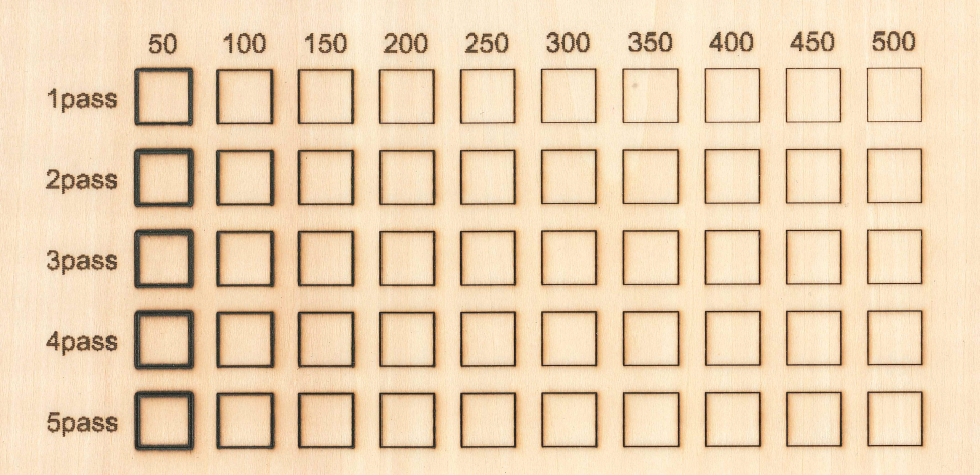 When Laser Power is determined, we need to adjust Work Speed to control the effect of laser cutting. To ensure that the workpiece can be cut through, we also need to set a proper value for Number of Passes. We can run cutting parameter tests through a matrix of Work Speed and Number of Passes. We stepwise increase values of Number of Passes and Work Speed, so that we can get a series of small squares on the workpiece, as shown in the figure below.