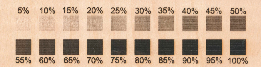 Laser Power controls the amount of energy in the laser beam. It can be set as a percentage between 0% and 100%. In laser engraving, the higher the Laser Power, the darker the engraving color. In laser cutting, a laser with higher power can cut deeper, but it will also result in seriously charred edges.