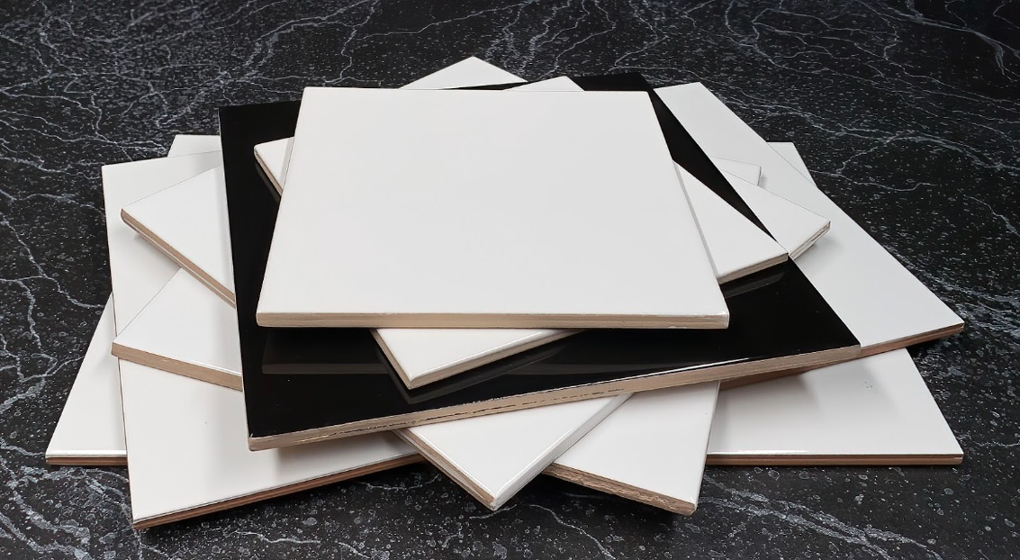These are widely available in construction stores, sometimes referred to as porcelain tiles. The glazed surface should be clean and free of grease, use isopropanol to clean it before using.