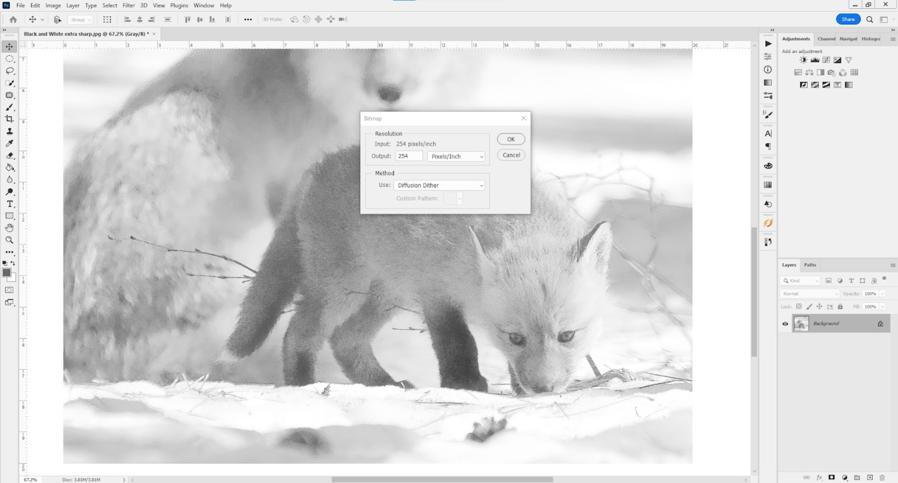 If you prefer to perform dithering in an external editor, your picture resolution before that should match the expected laser Fill Interval processing parameter in Snapmaker Luban (for example, a resolution of 10 dots/mm or 254 DPI is equivalent to 0.1 mm fill interval). For dithering, I would recommend Stucki or Floyd–Steinberg algorithms. Note that Adobe Photoshop has a similar method in its conversion to Bitmap tool, under Image Mode menu line, it is called Diffusion Dither.