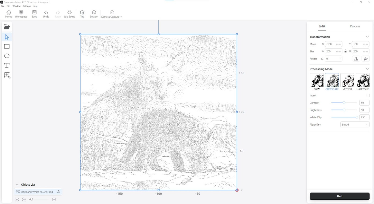 Once imported into Snapmaker Luban, previously adjusted grayscale pictures may require scaling to match the predefined working area. Then proceed with dithering, better using Stucki or Floyd–Steinberg algorithms. Do not forget to switch to the GREYSCALE processing mode. If the picture was not adjusted well enough in an external photo editor, some limited tweaking can be performed using Contrast and Brightness sliders (the picture should look considerably underexposed on the preview), but I would recommend adjusting levels elsewhere before importing. It is better to use Snapmaker Luban sliders only for fine tuning.