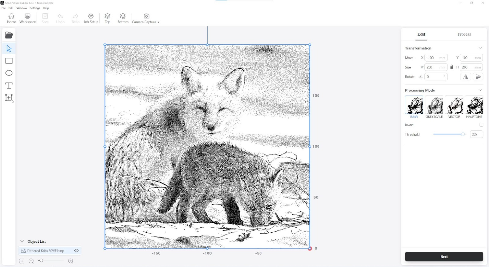 If your picture has been dithered in an external photo editor (recommended), switch to B&W processing mode after importing the bitmap file and scaling. Please note that your picture resolution should match the expected laser Fill Interval processing parameter in Snapmaker Luban (for example, a resolution of 10 dots/mm or 254 DPI is equivalent to 0.1 mm fill interval), otherwise you will get unexpected results. The Threshold slider in this case affects only the preview of the dots on the screen, not the final result (except its extreme values of 0 and 255), so do not rely on the preview, it could be misleading.
