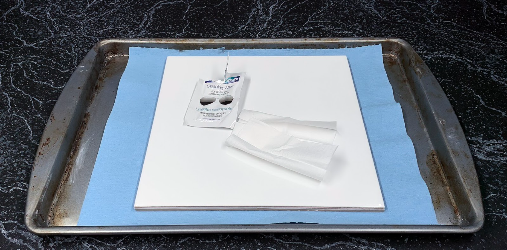 Once the tile is covered, let it dry for at least 2 hours at room temperature (isopropanol is flammable, keep away from sources of ignition!) . After that, it is ready for laser treatment.