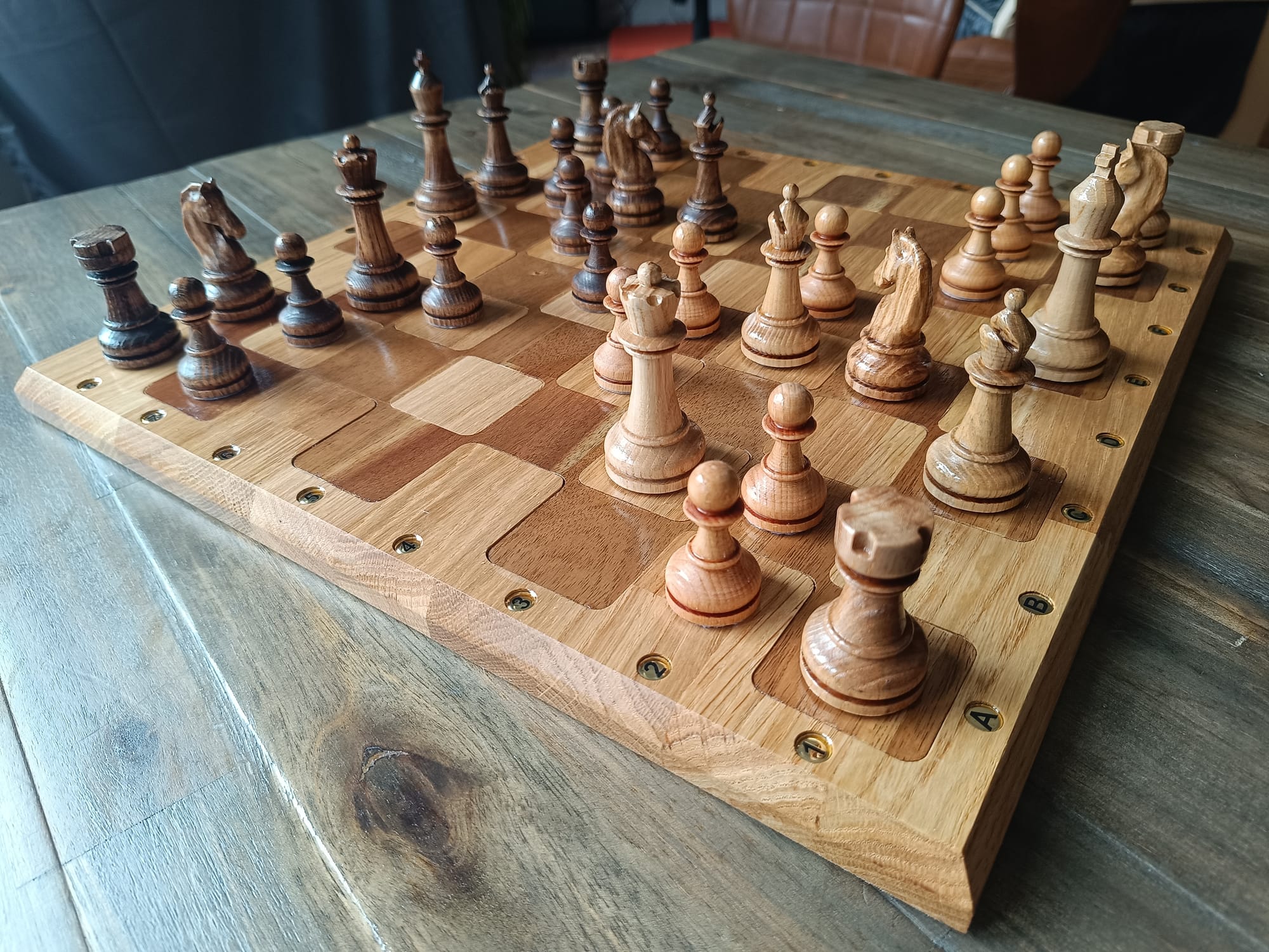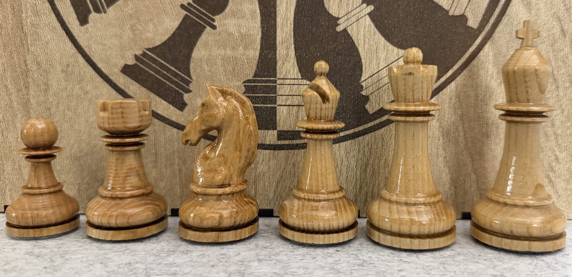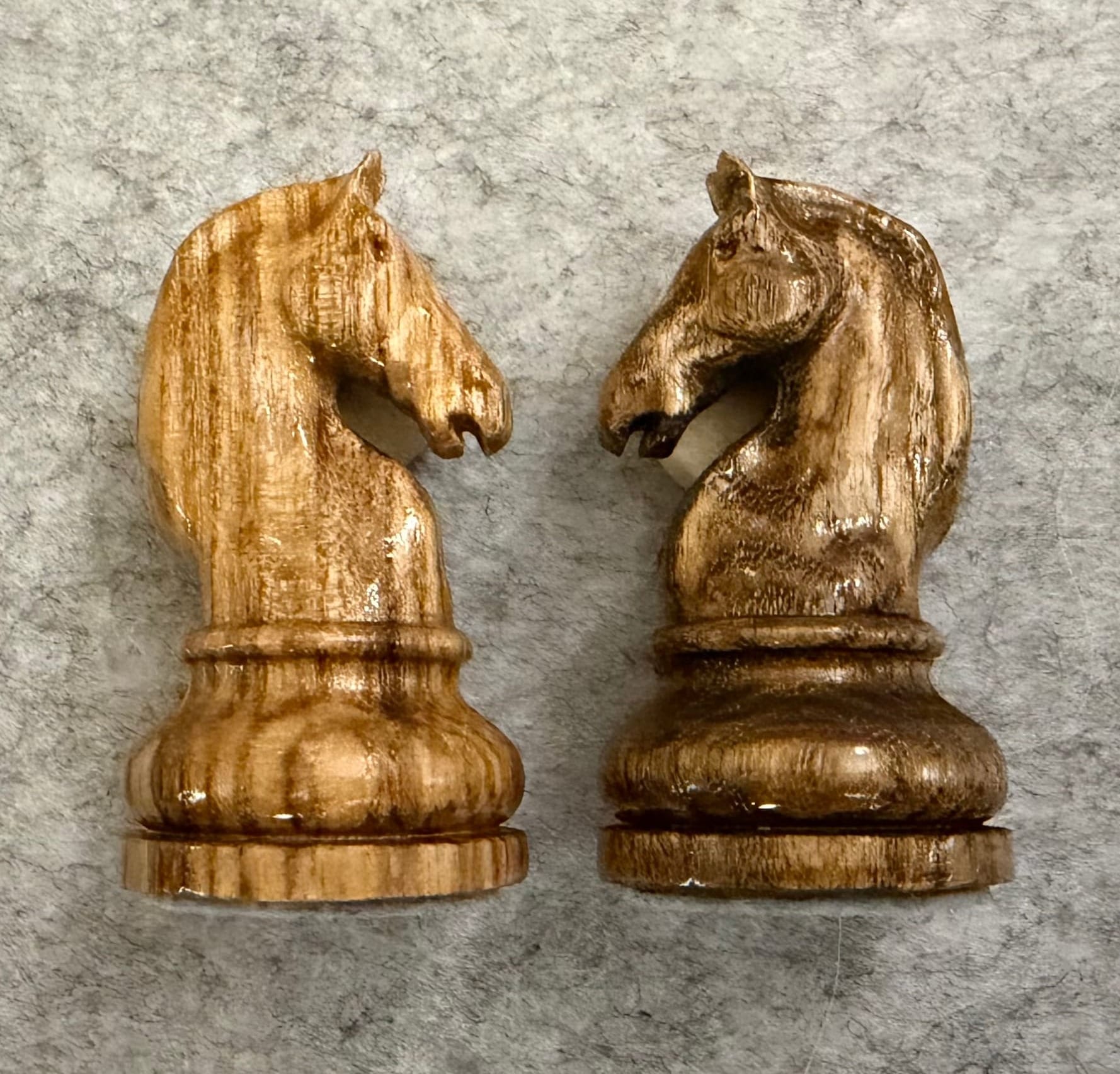 There are countless ways to finish the figures. I decided to simply apply a thin coat of clear varnish to the white figures to make them shine and to colour the black figures beforehand with a dark stain that does not cover the grain of the wood.
