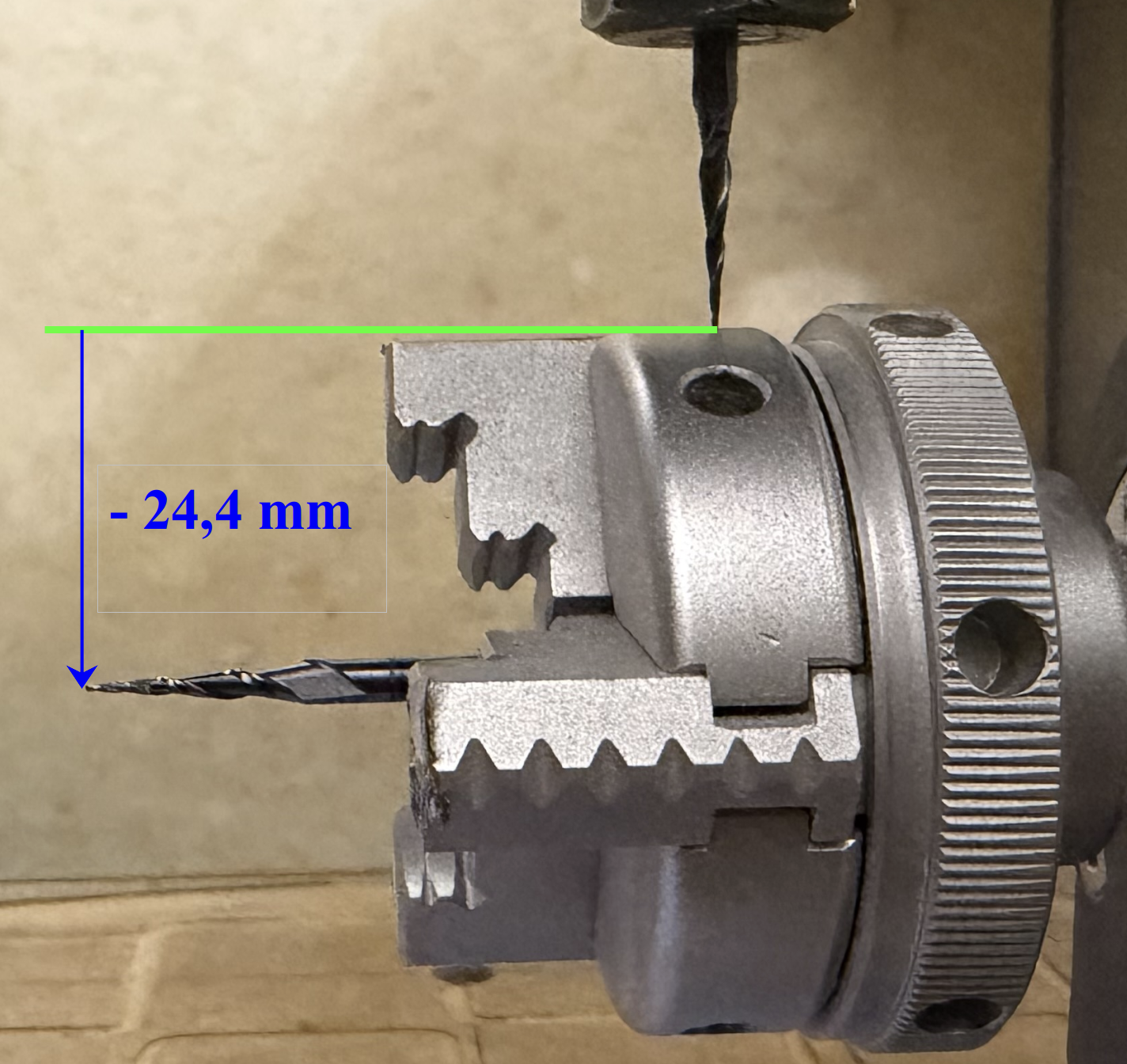 As can be seen in the pictures, I clamp a V-cutter with a narrow tip into the rotation module and the milling cutter and move the CNC manually by eye as accurately as possible so that the x and z coordinates of the two tips match and zero the milling head. I note down the absolute x-coordinate as the x-coordinate of the rotation axis. I then move the milling cutter to a fixed point on the module, as shown below, and note down the z-coordinate of the work coordinates. In my case, this was 24.4 mm, as can be seen in the pictures.