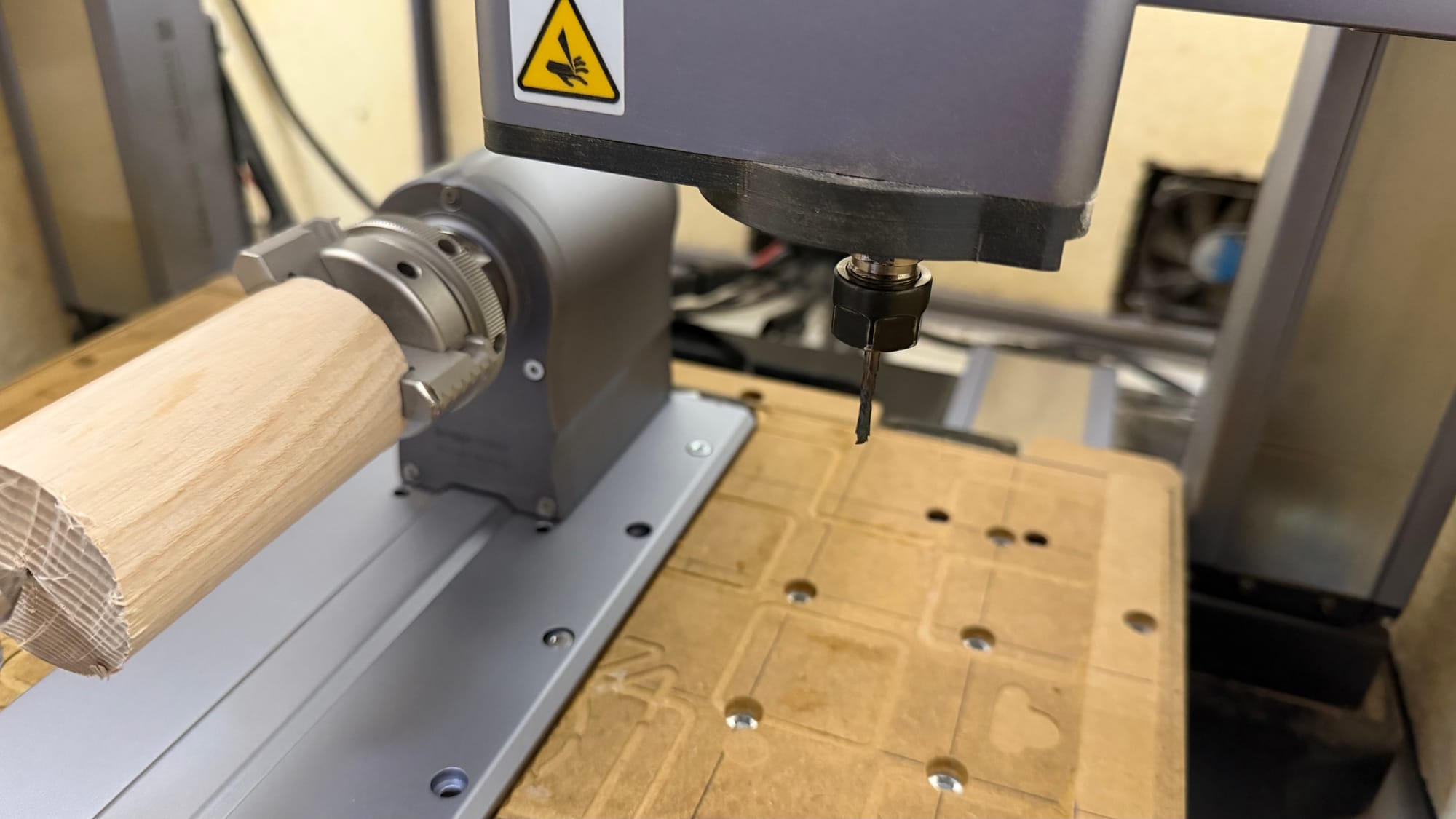 At this point, we would like to point out a bug. If you have exported several rotational milling processes together in Fusion, the rotation module may get stuck in an endless rotation loop after the process is complete. Although the cutter is moved upwards to a safe distance, the module simply continues to rotate endlessly instead of declaring the process complete. In this case, you must restart the machine and reset everything before continuing. The tip of the rear split pin (‘SplintB’) will help you to determine the correct alignment of the workpiece again.
