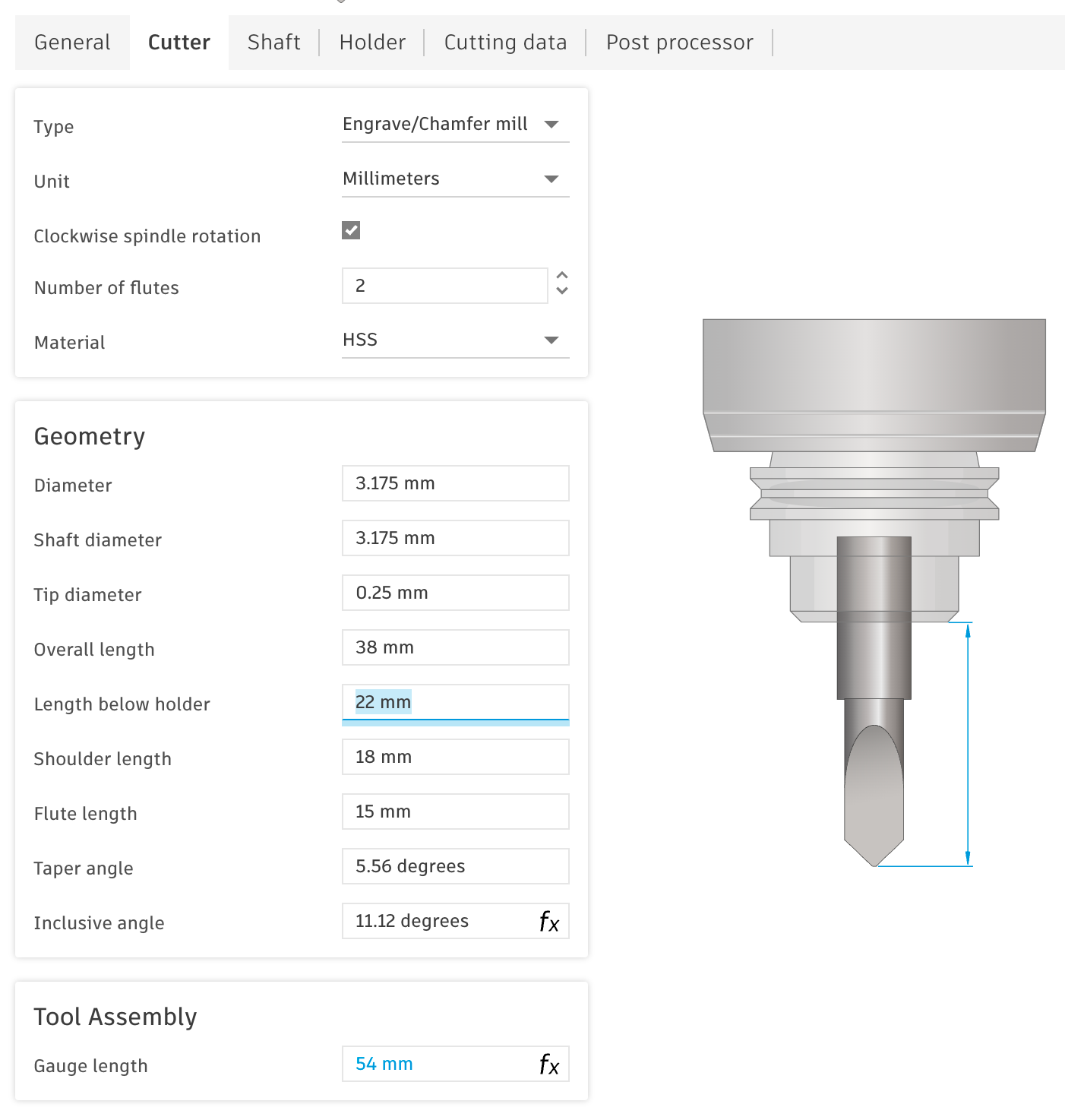 - Shaft & Holder: Here you specify the safety distance to be maintained from the rest of the material when milling and moving the milling head. It is important to note that Fusion 360 only attempts to adhere to these specifications, but does not always manage to do so reliably. You must therefore check later in the simulation whether any collisions have occurred.