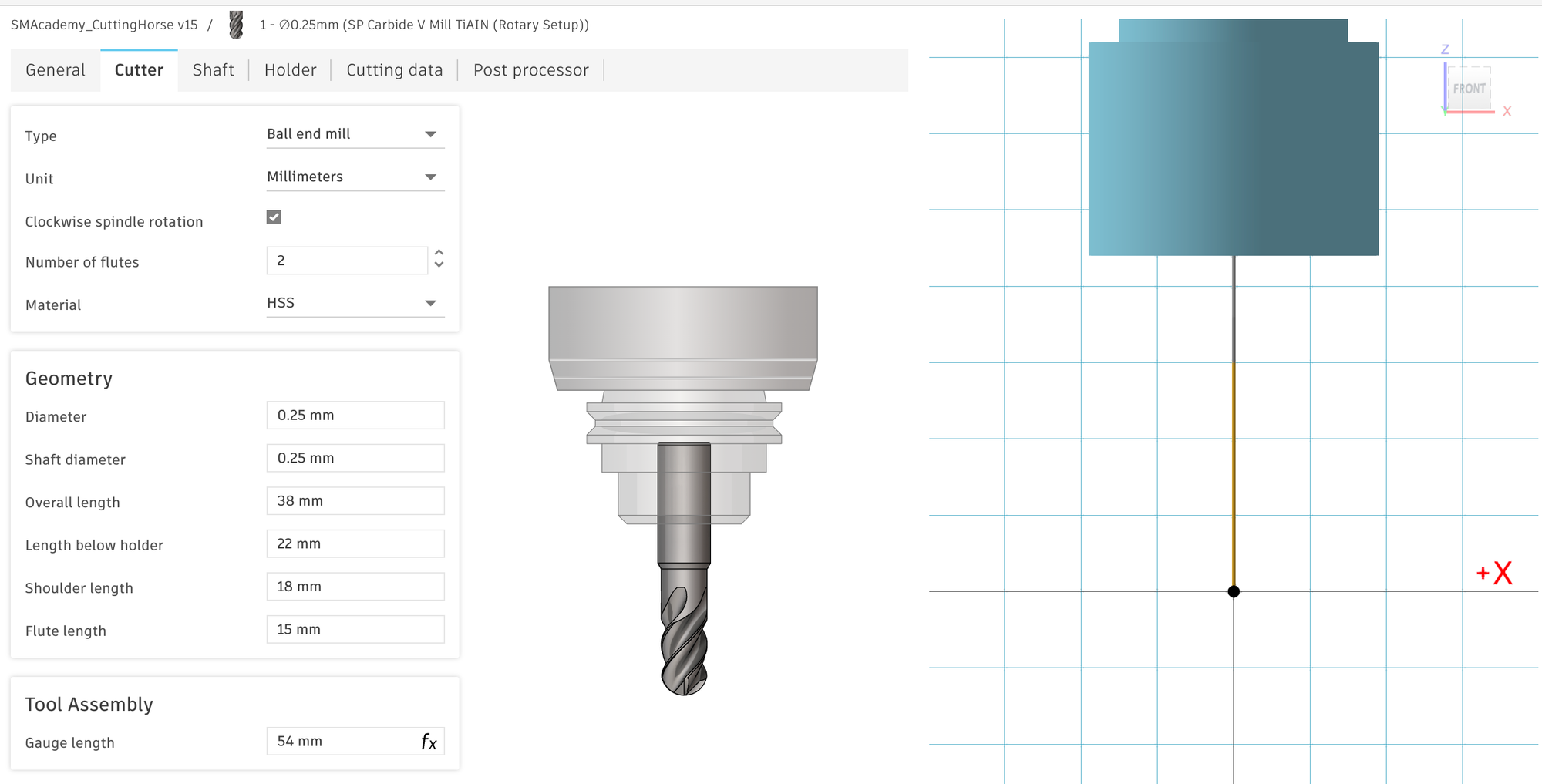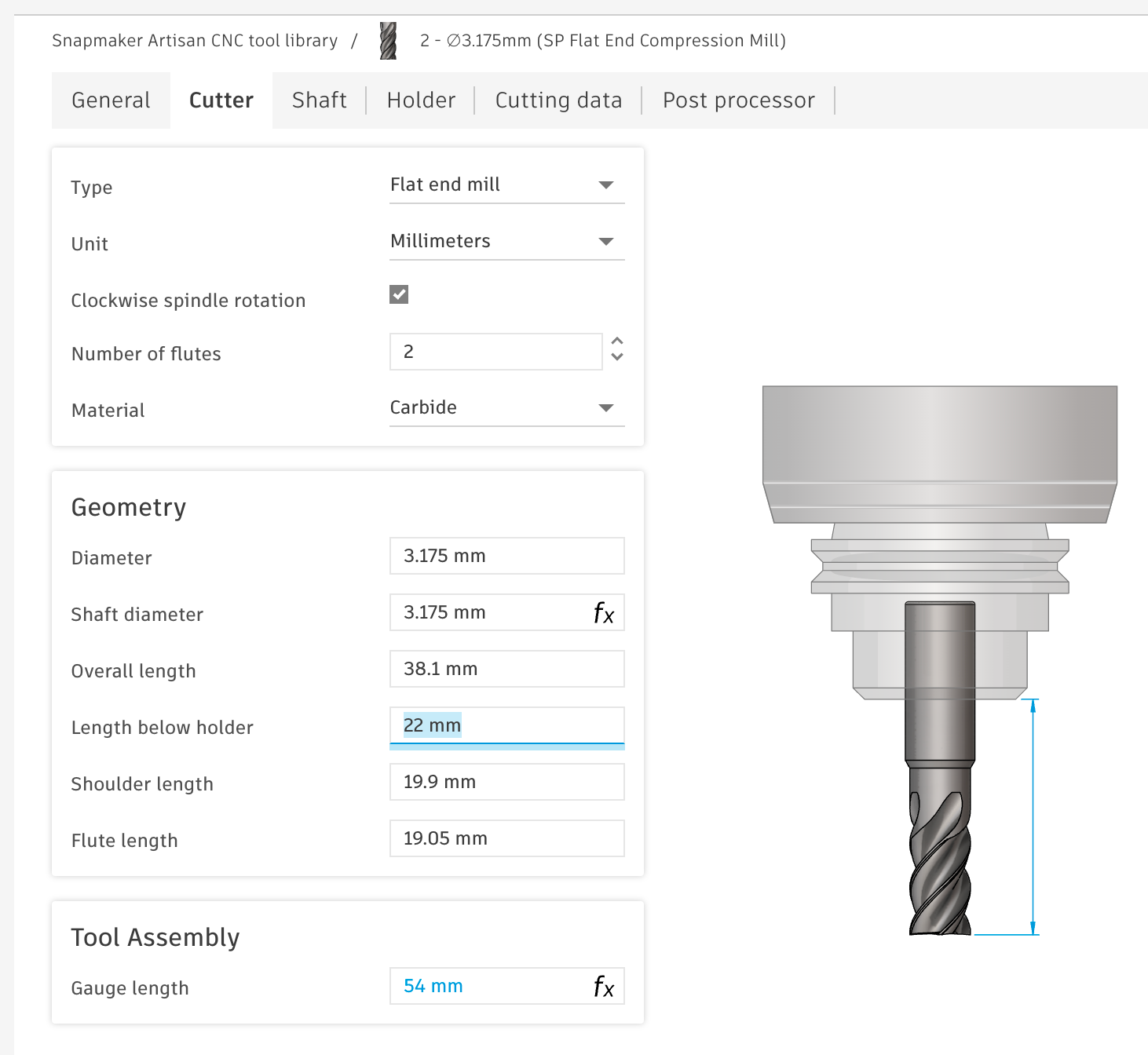 In any case, you will need to check the cutter data for the tools in the tool library, as it may not be completely correct or may be incomplete. The following images show my settings for the SP tools. In particular, you should check the ‘Length Below Holder’ setting and add the correct holder for the first time. For the Artisan, this is a holder with a gauge length of 32 mm. If these settings are incorrect, it is possible that milling paths will be calculated in which the cutter holder will be rammed into your workpiece.