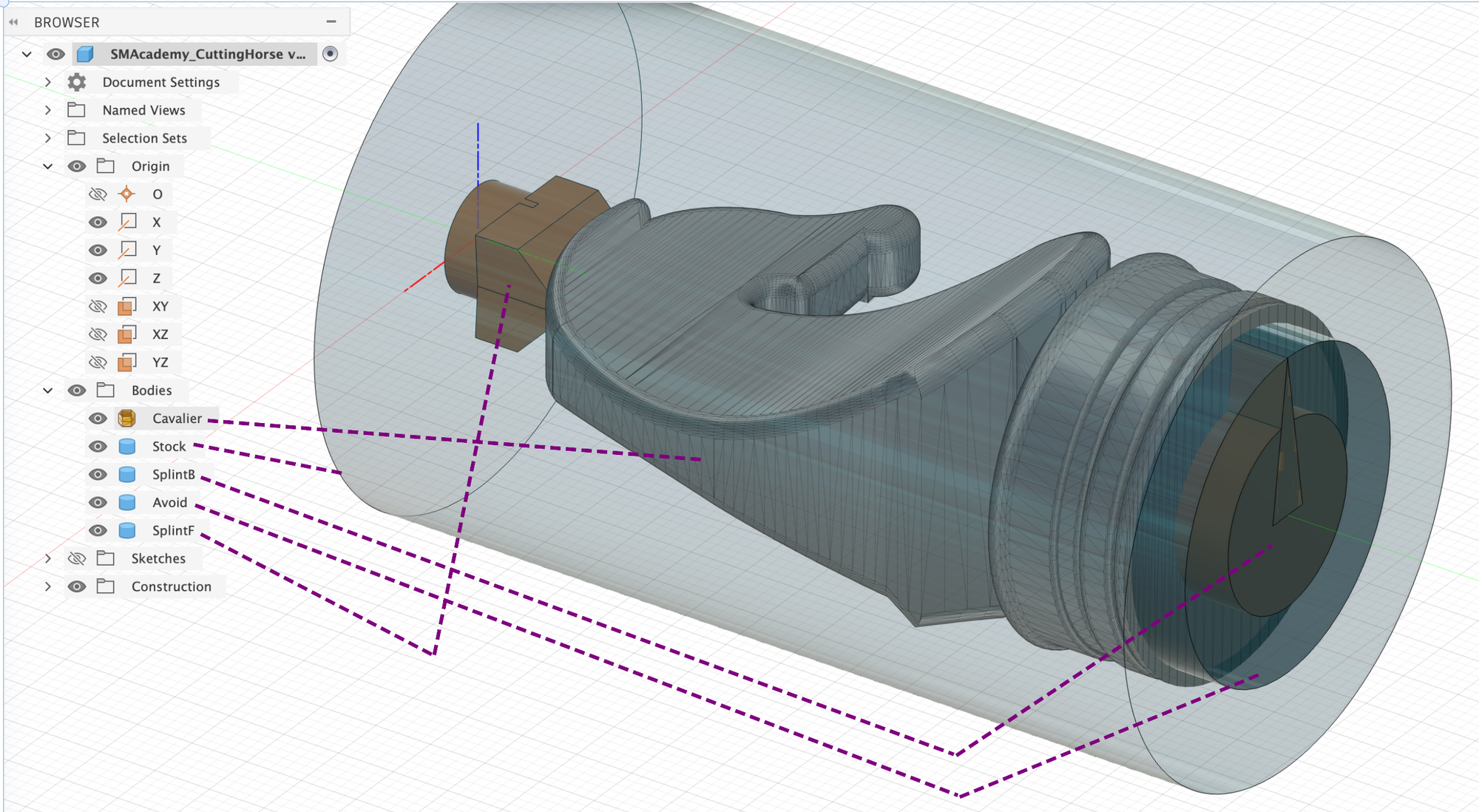 - Stock: This cylinder represents the piece of ash wood round bar with a diameter of 44 mm from which the figure is to be milled.