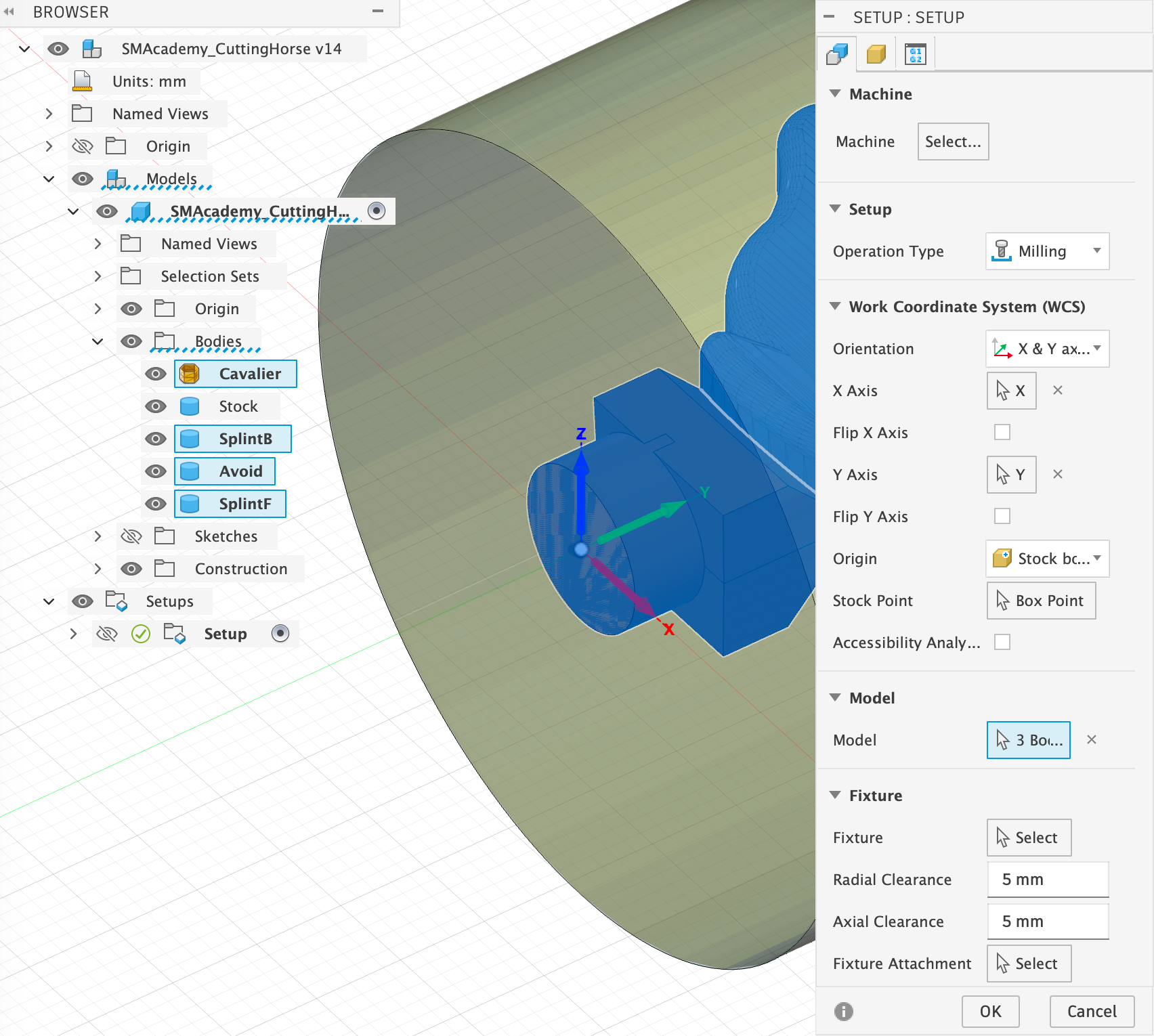 During setup, you essentially only need to select the correct stock body and set the coordinate system correctly so that the rotation module can work correctly later on. As already mentioned, I always set my coordinate origin to the rotation axis at the very end of my stick material. To do this, I simply aligned the material cylinder in Fusion 360 along the y-axis of the Fusion 360 coordinate system and was therefore able to simply adopt the standard coordinate system for the setup, as shown in the image: