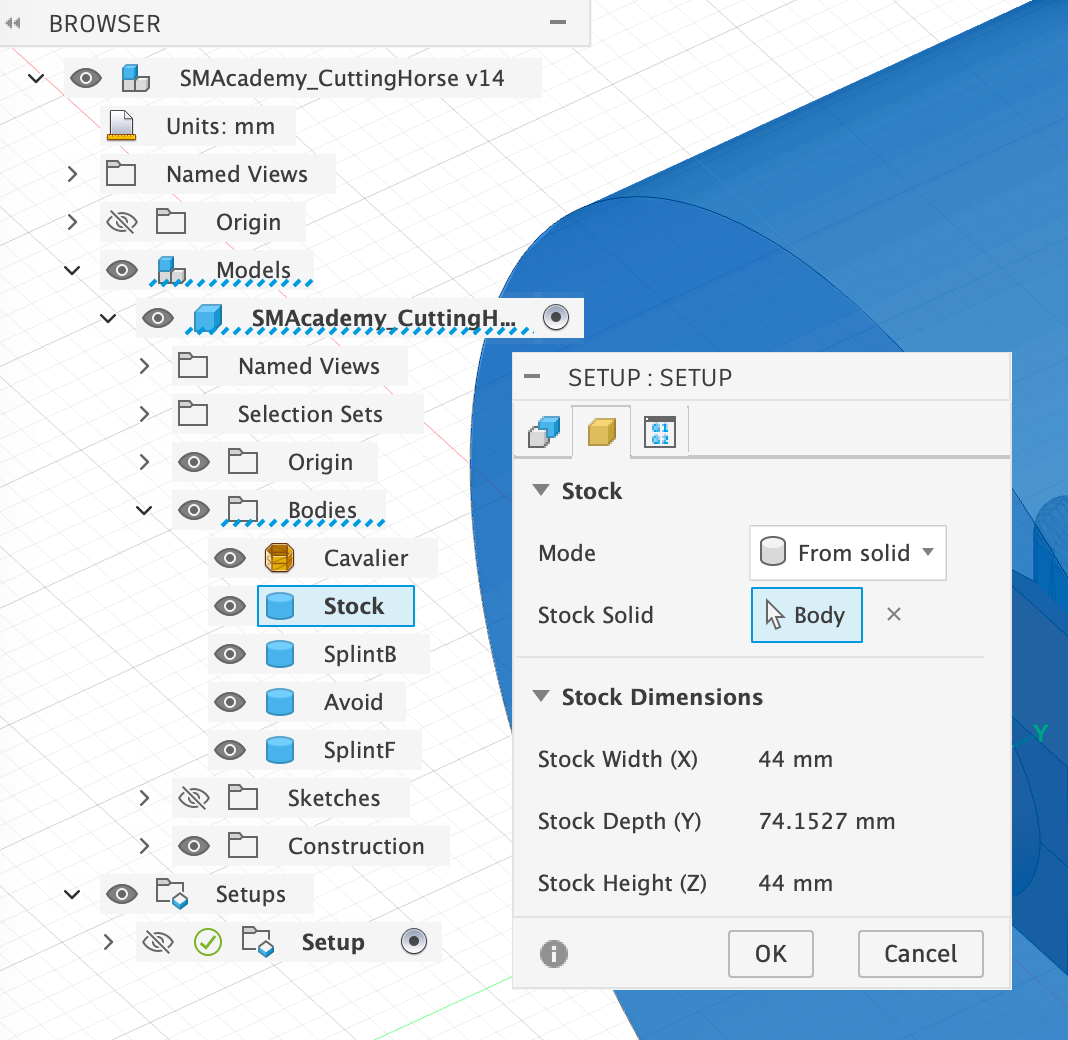 - Model Surfaces: We select all objects except the stock body itself. These are the objects that are to be milled. Note that it says ‘3 Body’ here, because the horse itself is a mesh and was therefore selected, but is not counted when counting the selected ‘bodies’.
