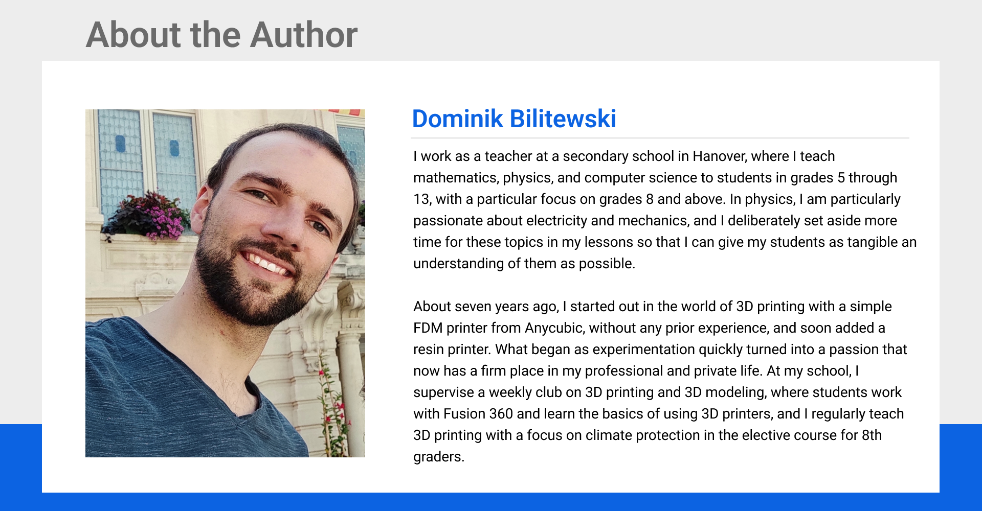 I work as a teacher at a secondary school in Hanover, where I teach mathematics, physics, and computer science to students in grades 5 through 13, with a particular focus on grades 8 and above. In physics, I am particularly passionate about electricity and mechanics, and I deliberately set aside more time for these topics in my lessons so that I can give my students as tangible an understanding of them as possible.