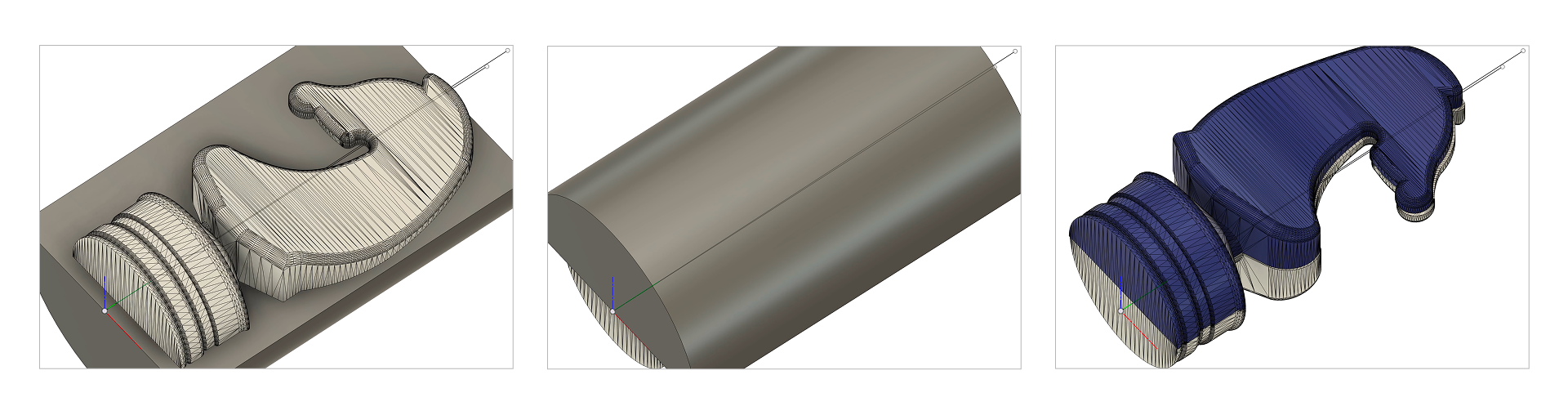 The horse is the most complicated piece in the set, which is why I chose it for the tutorial. In general, it is easier if larger parts of the figure are rotationally symmetrical. However, the figures are all milled in two steps – first, rough machining with the larger flat end mill, followed by longer, finer machining with the V-mill. To better control when which tool will be used to machine which areas, use placeholders, among other things, which are initially left out during milling: