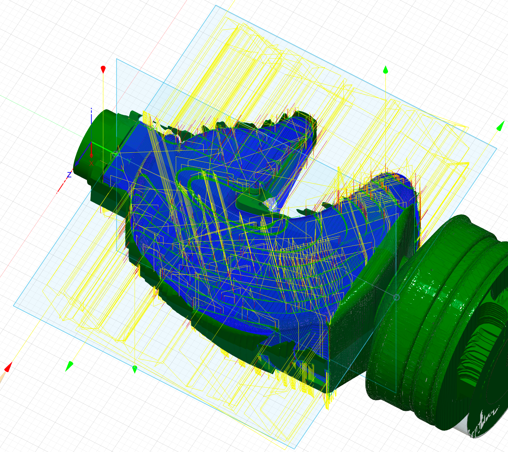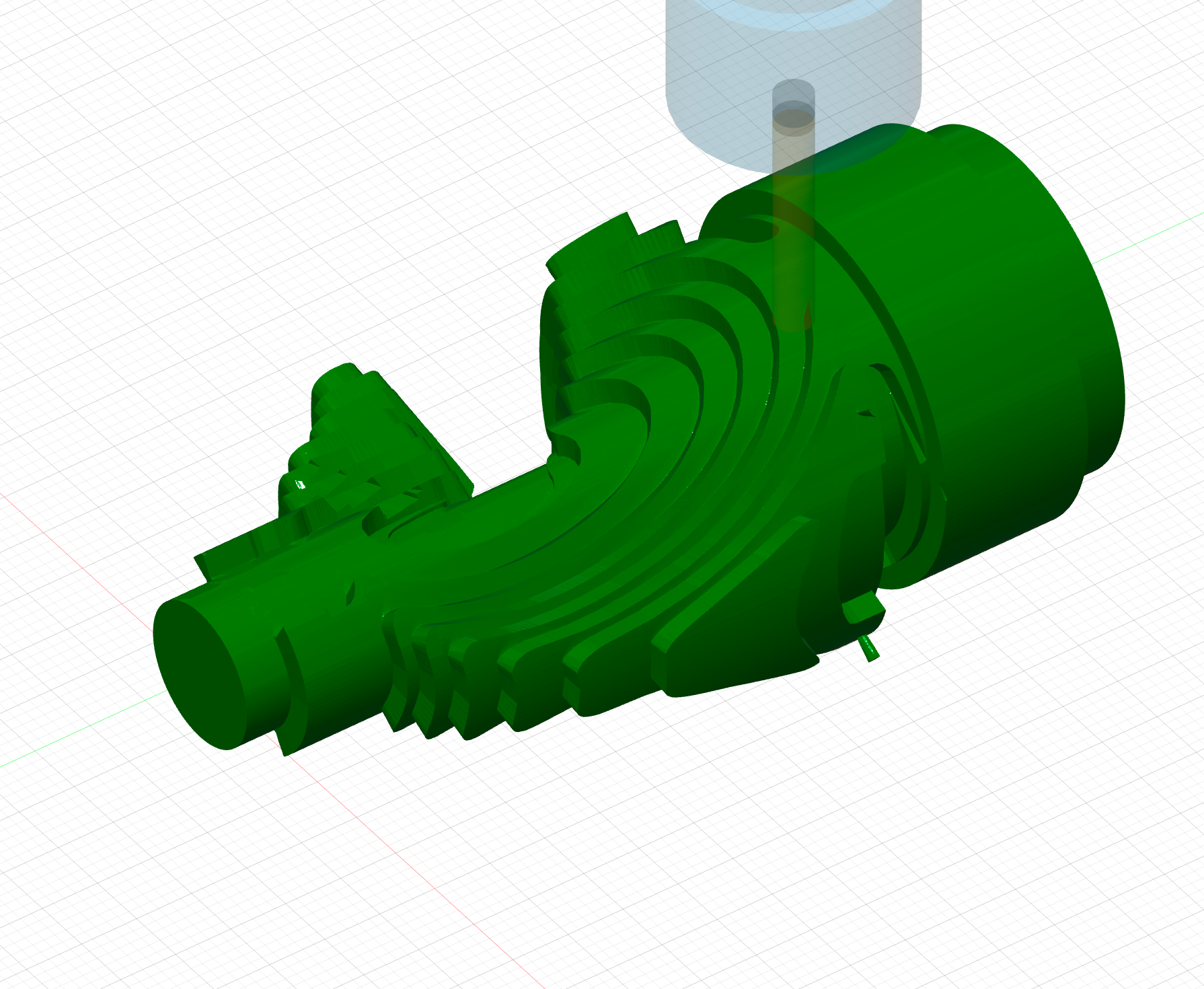 The following rotary parallel method is used to machine the areas that have not yet been milled down to 1 mm of residual material. Otherwise, in my experience, the remaining machining with the V-mill takes too long.