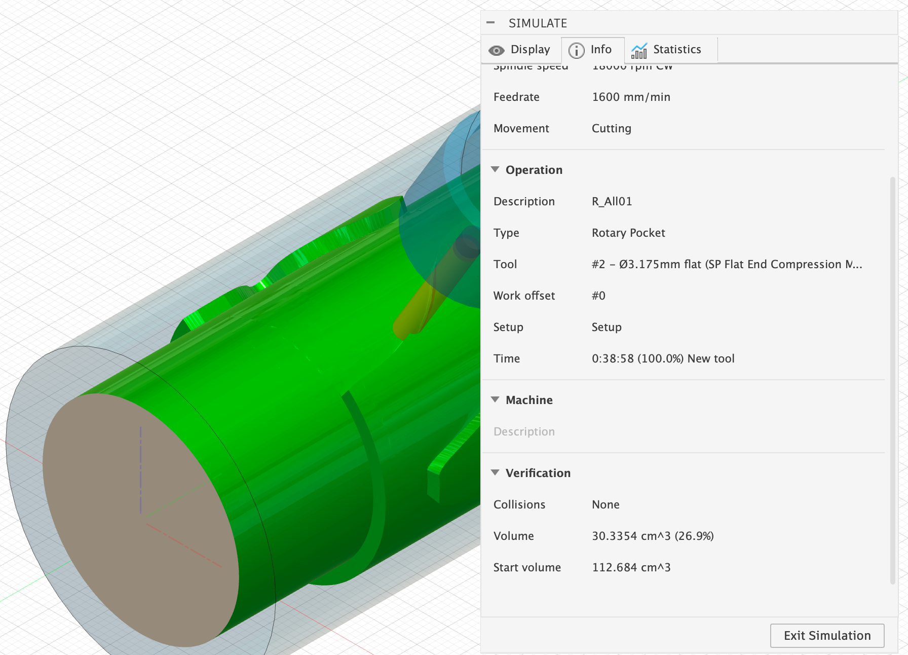 Once your milling process has been calculated, be sure to start the simulation under Actions > Simulate. There, check under Info > Verification to see if there have been any collisions (see image on the right). If so, you may need to adjust your inner radius again.