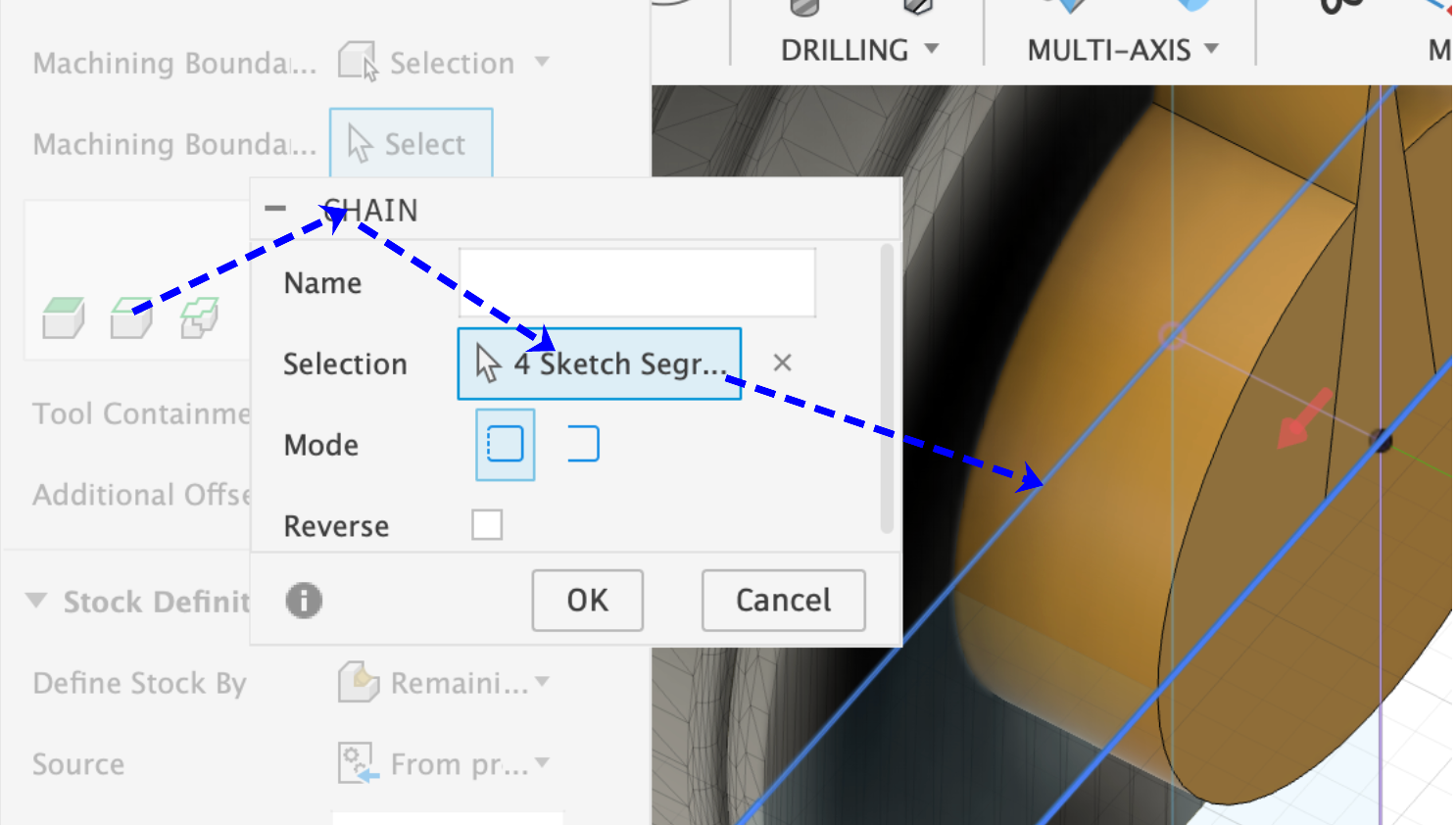 - Geometry: Here, the movement of the milling head must be restricted to the interior of the previously created sketch. To do this, select ‘Selection’ under Boundary, then click on the ‘Chain’ icon and select the rectangle from the sketch (see image below).