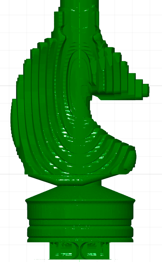 When fine machining, we want to carve out the figure as precisely as possible so that we have to do as little manual reworking as possible afterwards. With the figure used here, which has many smooth surfaces, this is of course not very efficient. However, the horse figure I actually made has finely chiselled fur and facial details that cannot simply be reworked with sandpaper.