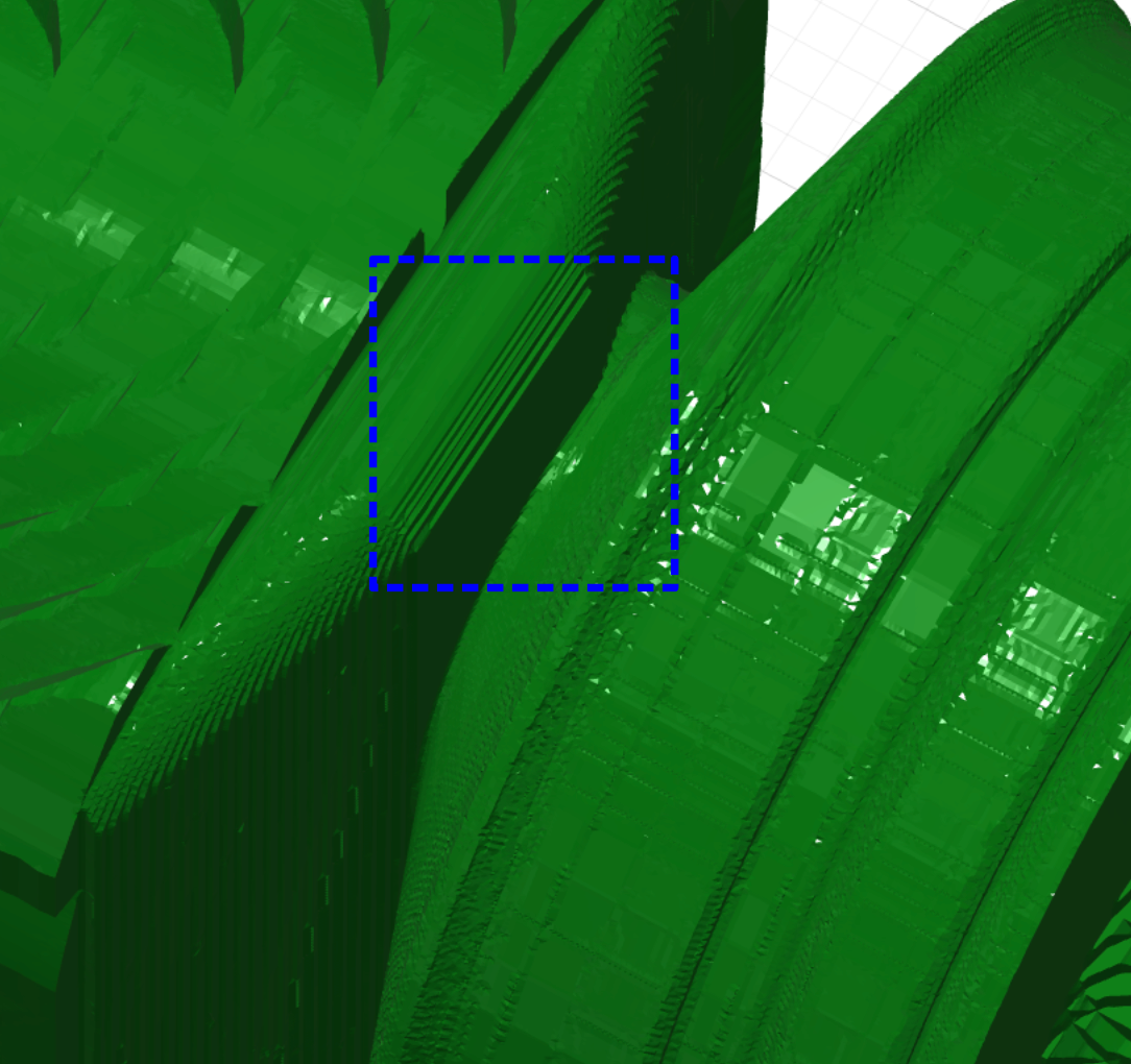With this tool, we can then use the rotary parallel method. Please note that from this point on, the simulation will no longer correspond to reality, as in reality a 0.25 mm narrow flat end mill will not be used, but rather the V-mill. This will automatically cause problems if you try to machine a wall parallel to the tool in this way. The wall marked in the image on the right, for example, will receive a chamfer from the V-mill.