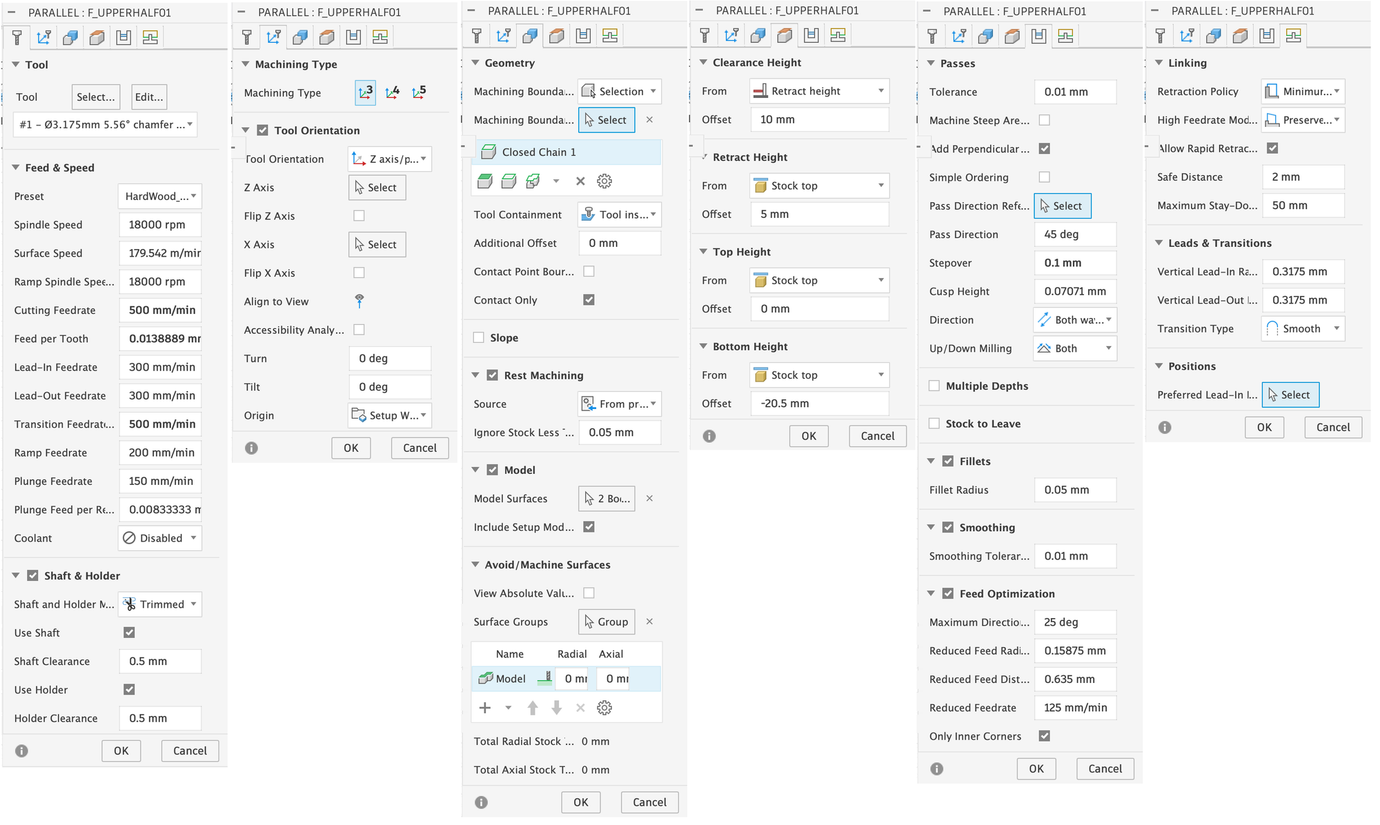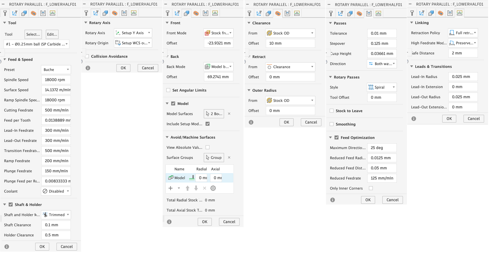 - Feed & Speed: The values here are relatively conservative, as time was not a major factor for me. The main problem with machining too quickly is that you can cause stronger vibrations in the material, which can cause the entire workpiece to come loose from the collets, meaning you can then discard it.