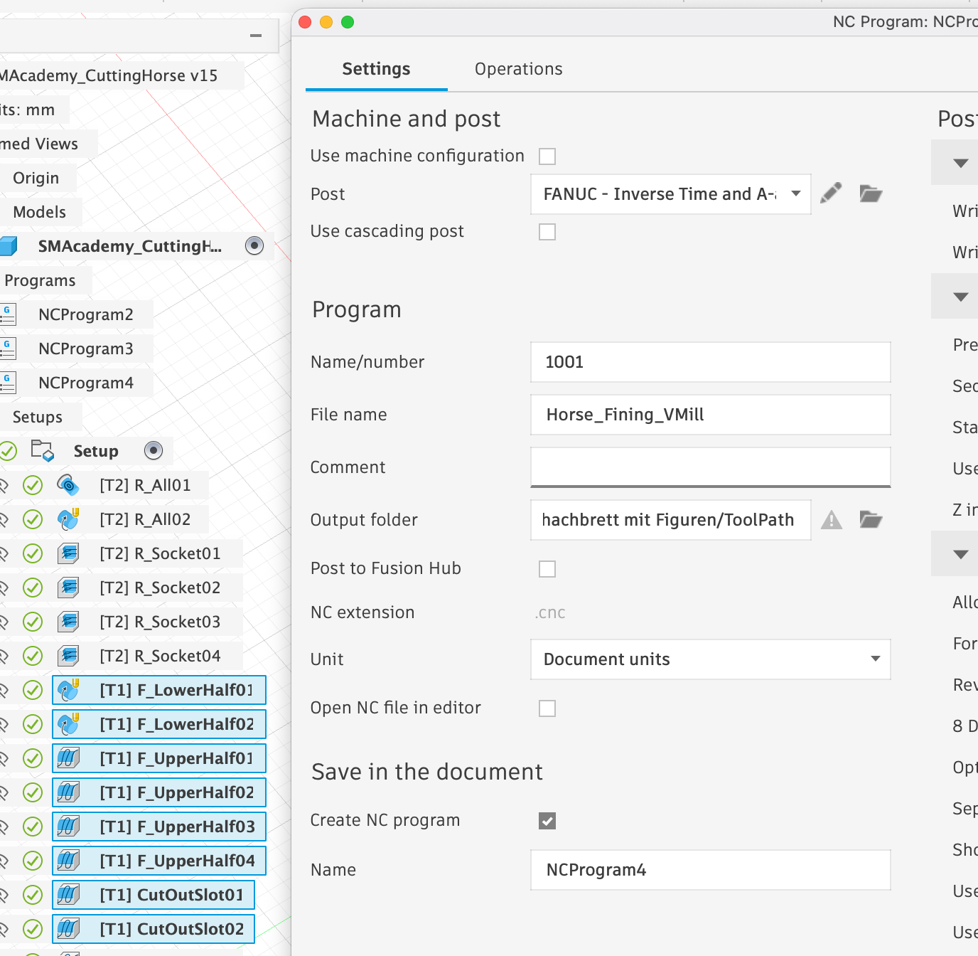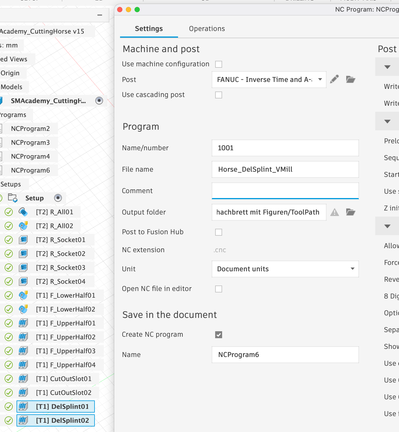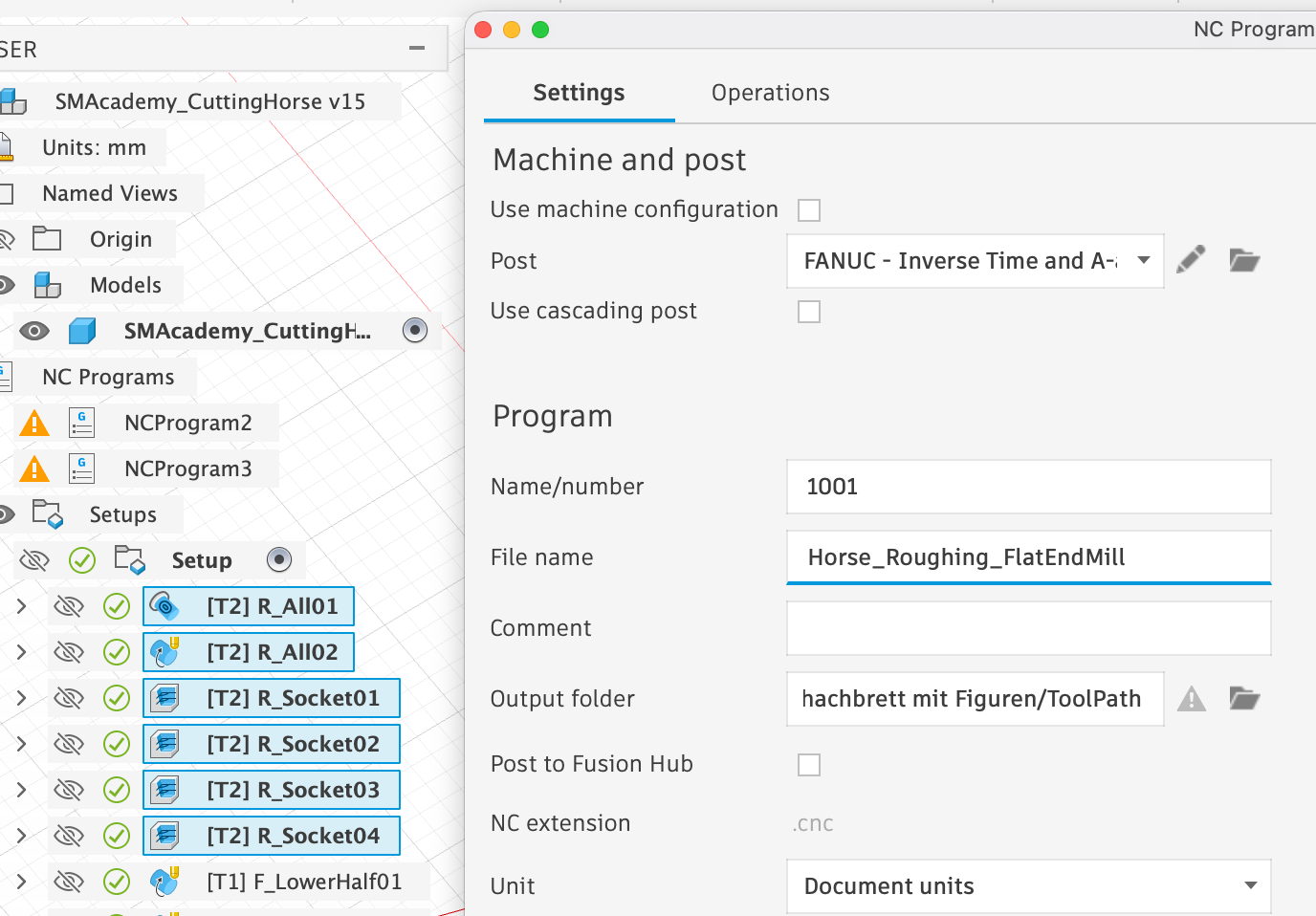 First, we select all milling operations that use the flat end mill and click on Post Process under Action. In the window that appears, we only need to select ‘Fanuc’ under Post, as this is the post-processor that supports the rotation module, and choose a meaningful ‘File Name’: