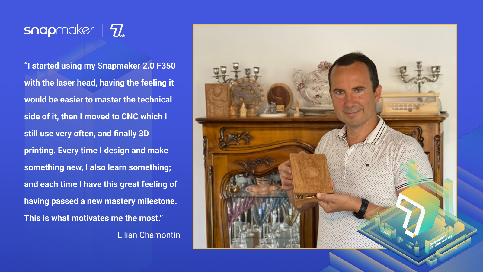 Approaching the end of June, our 7th Anniversary Column also comes to its last episode. Over the past month, we are happy to talk to different users and get to know their stories. Lilian Chamontin from France often surprised the community with beautifully made CNC projects. He is also an active participant in our Snapmaking Contest held quarterly.
