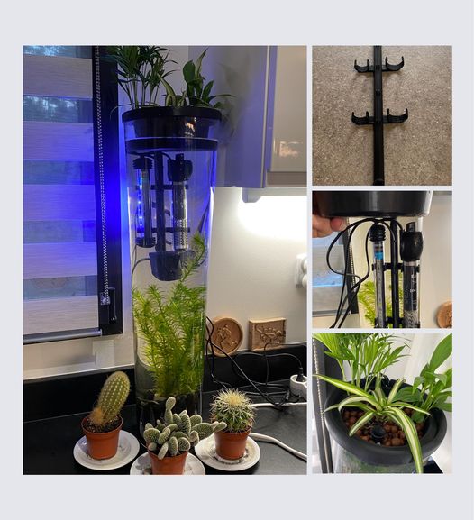 An aquarium system with integrated aquaponics, made from an old vase (20/25 liters) and black PLA. Lilian 3D-printed the pump/heat/light holder and the top flowers/filtering system.