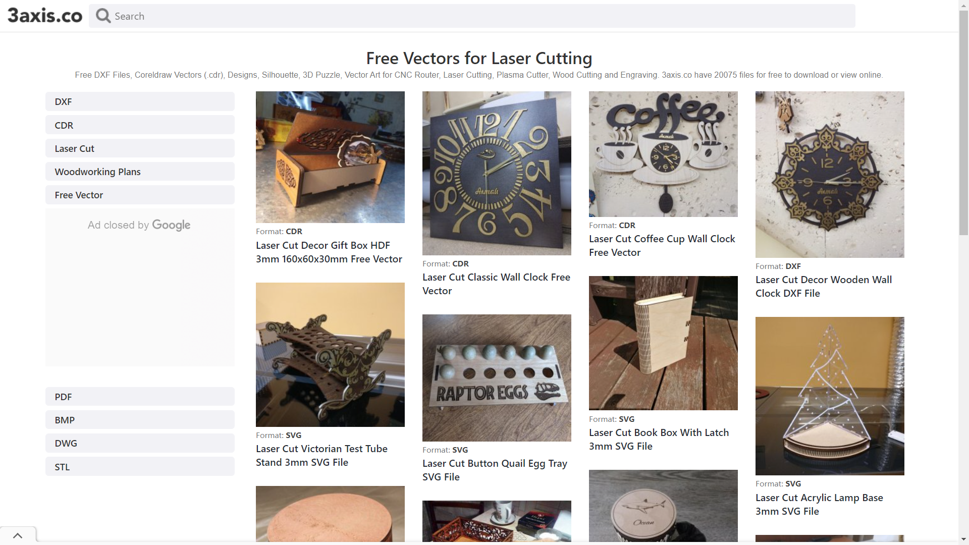 3axis.co is a large repository of laser cutting designs and other vector files. You can find templates for various objects, such as gift boxes, lampshades, rocket models, clocks, chessboards, wall decorations, and many more. All of those are creative and practical designs that will definitely add fun to your life.