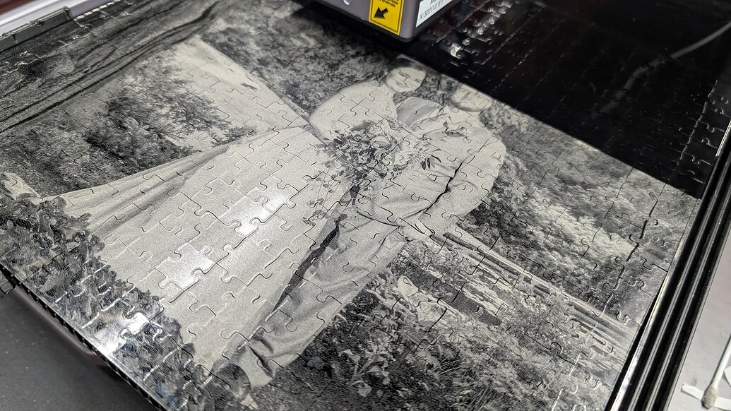 auggieben I wanted to share the projects I worked on for some of this years Christmas presents. I decided to use the 10W and the 2W IR laser to make jigsaw puzzles from photos of my kids weddings this year. Both photos were cropped to fit a 12"x12" (304mm x 304mm) piece of black cast acrylic. The jigsaw pattern was cut first using the 10W laser, then the 2W IR laser etched the photos onto the acrylic. The Quick Swap kit really came in handy for this job. I wanted to use Luban for the entire project, but it struggled when processing the pictures so I switched to Lightburn for that portion. We’ll enjoy putting these together when the family gathers for the holidays.