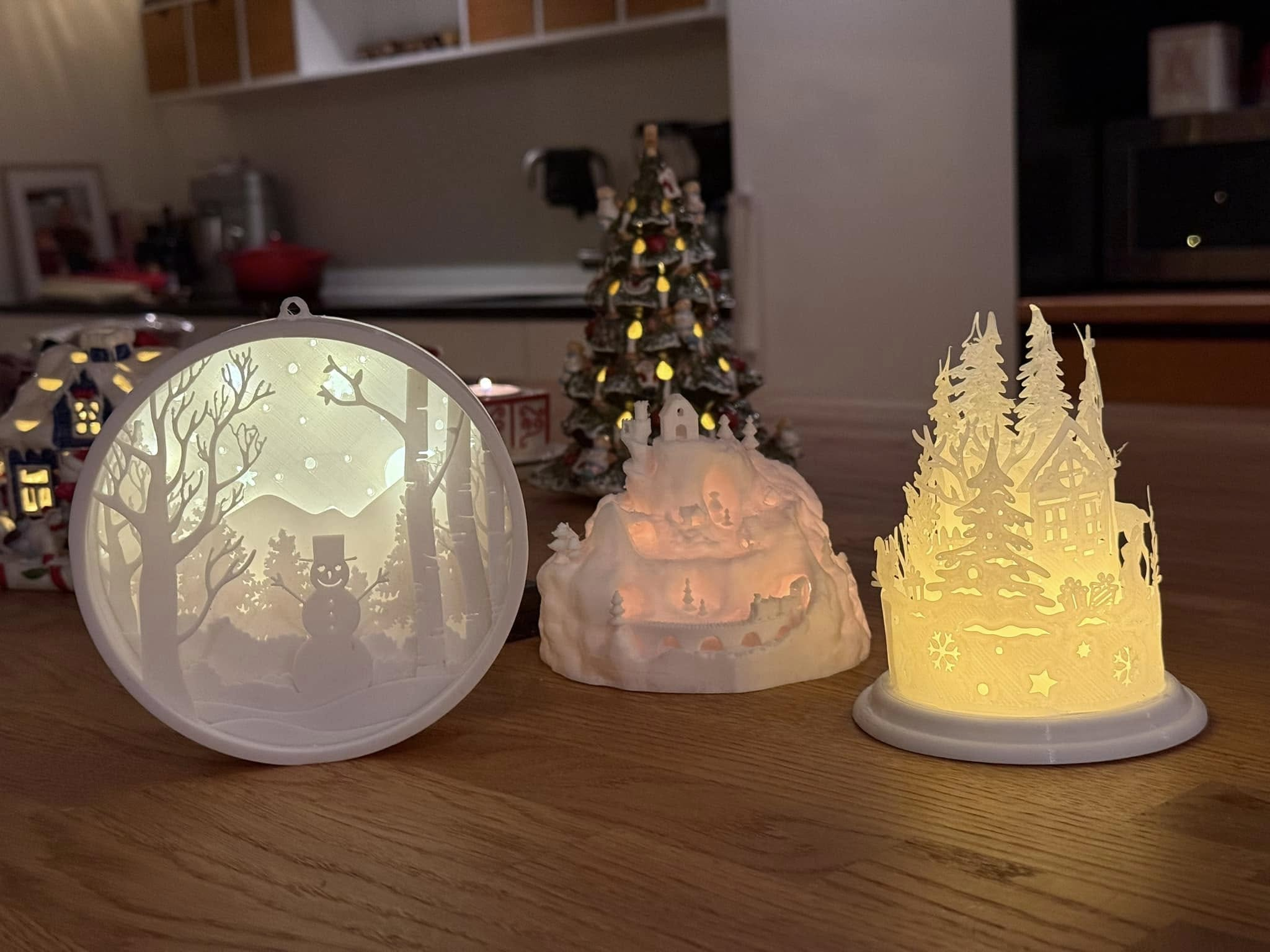 Marius Ebbesen Some 3D printed ornaments I added to the Christmas decorations this year, while testing printing with ABS. The layered snowman lantern is my favourite