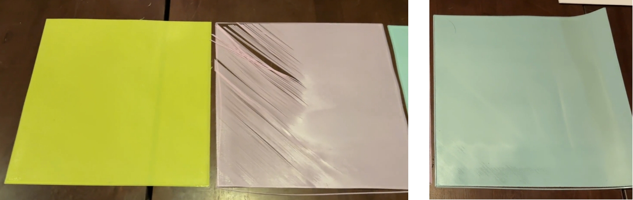 - Special findings from Claire: First layer 3D printing quality from best to worst: Unreinforced + manual leveling (yellow - perfect) > Reinforced + automatic leveling (cyan - good) > Unreinforced + automatic leveling (pink - poor) [Troubleshooting Explained: Inaccurate leveling probe data. Problem occurrence: In the z-offset calibration, it may cause deformation due to the insufficient rigidity on the X-axis, leading to inaccurate probe data at that point, subsequently affecting the overall automatic leveling compensation calculation result, causing automatic leveling failure and first layer printing failure (pink). When the user probe data manually, this problem can be avoided, resulting in perfect leveling (yellow). Note: Since both the yellow and pink prints were printed with un-reinforced Y axes, it can be inferred that the primary influencing factor is the rigidity of the X-axis.]